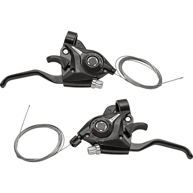 A solução completa para sua bike com 21 velocidades! A Alavanca de Câmbio Rapid Fire 3x7 com manetes integrados para freios V-brake ou a disco é ideal para ciclistas que exigem desempenho, praticidade e custo-benefício. Com mostradores de marcha e regulagem de tensão nos cabos, oferece trocas suaves e precisas para qualquer estilo de pedal.