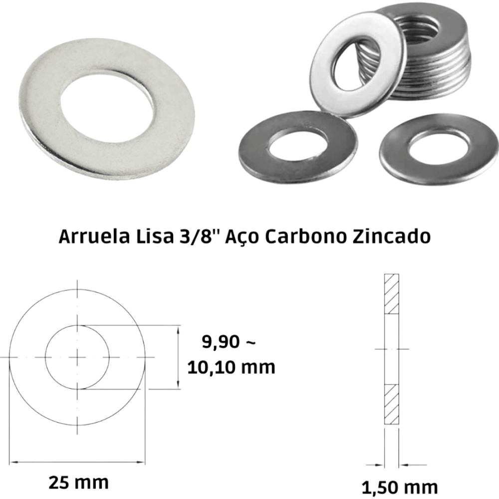 Com um diâmetro interno de 9.90 a 10.10 mm e externo de 25 mm, a arruela lisa é fabricada conforme a norma mecânica Padrão Masterpar, garantindo precisão e confiabilidade. A espessura de 1.50 mm assegura uma fixação estável e segura, essencial para manter a integridade das montagens.