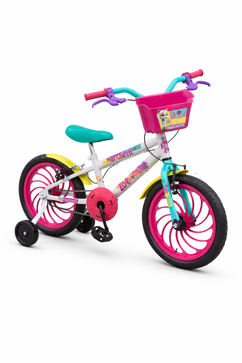 A Bicicleta Aro 16 Zoe Marchetti é perfeita para crianças que estão iniciando no mundo do ciclismo, oferecendo segurança, conforto e um visual encantador nas cores branco, rosa e verde. Desenvolvida com quadro em aço resistente, garante maior durabilidade e estabilidade para o uso diário.