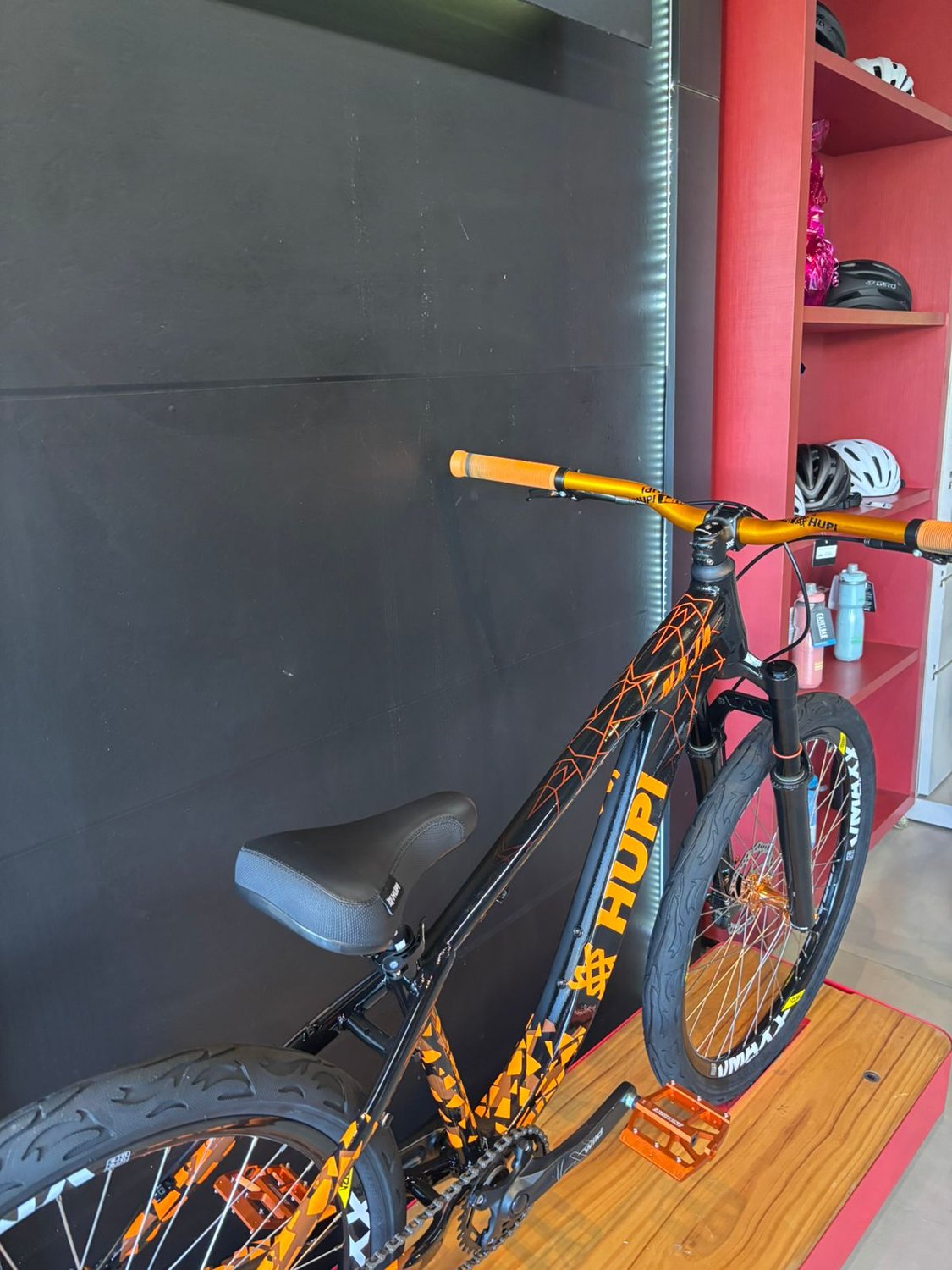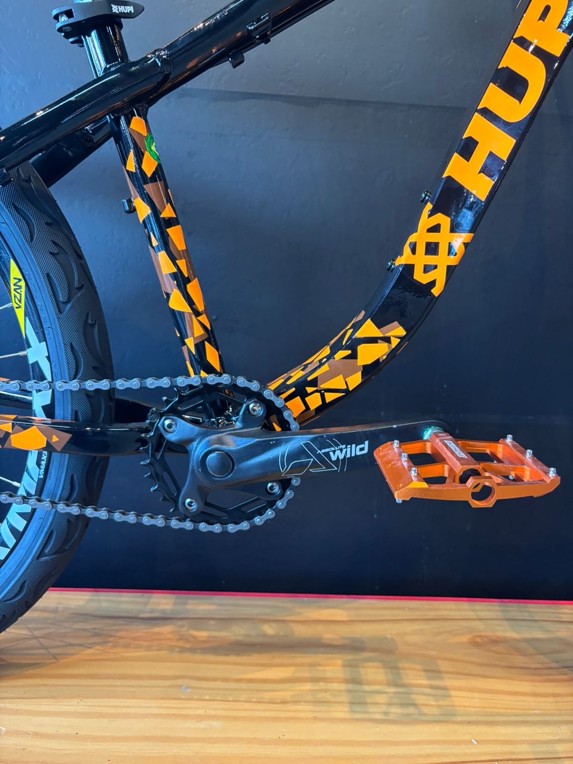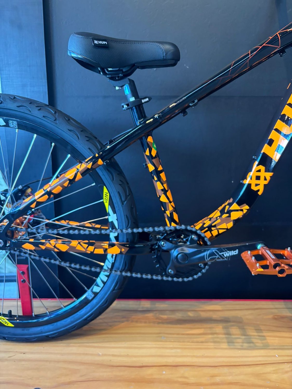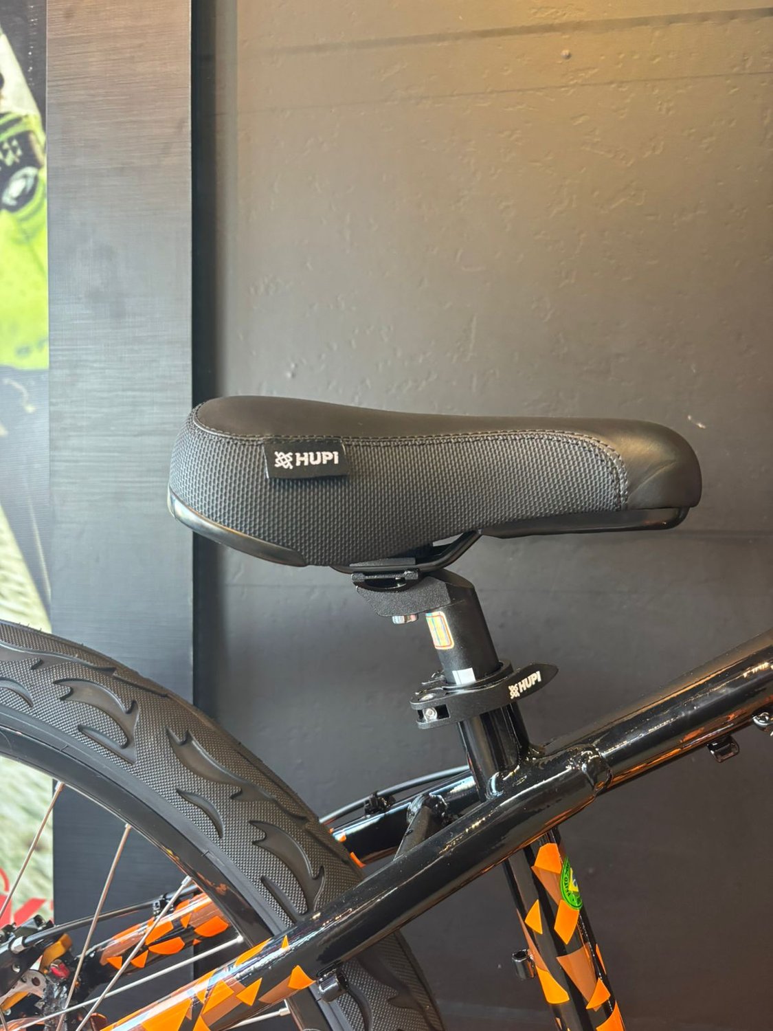 O visual preto com laranja reforça a identidade da Hupi, trazendo um estilo agressivo e moderno que chama atenção por onde passa, combinando perfeitamente com a proposta urbana e radical da bike.