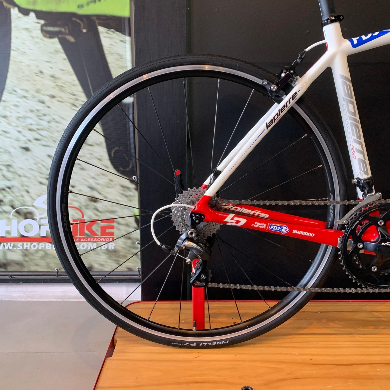 A experiência de pilotagem é ainda mais refinada com freios Shimano 105, garantindo precisão e segurança nas frenagens. O cockpit assinado pela Ritchey com guidão de 440mm, mesa de 100mm e canote Pro completa o conjunto com ergonomia e confiabilidade. Os aros Axis Elite e pneus Pirelli P7 trazem ótima aderência e rolagem suave, ideais para ciclistas que não abrem mão da performance.