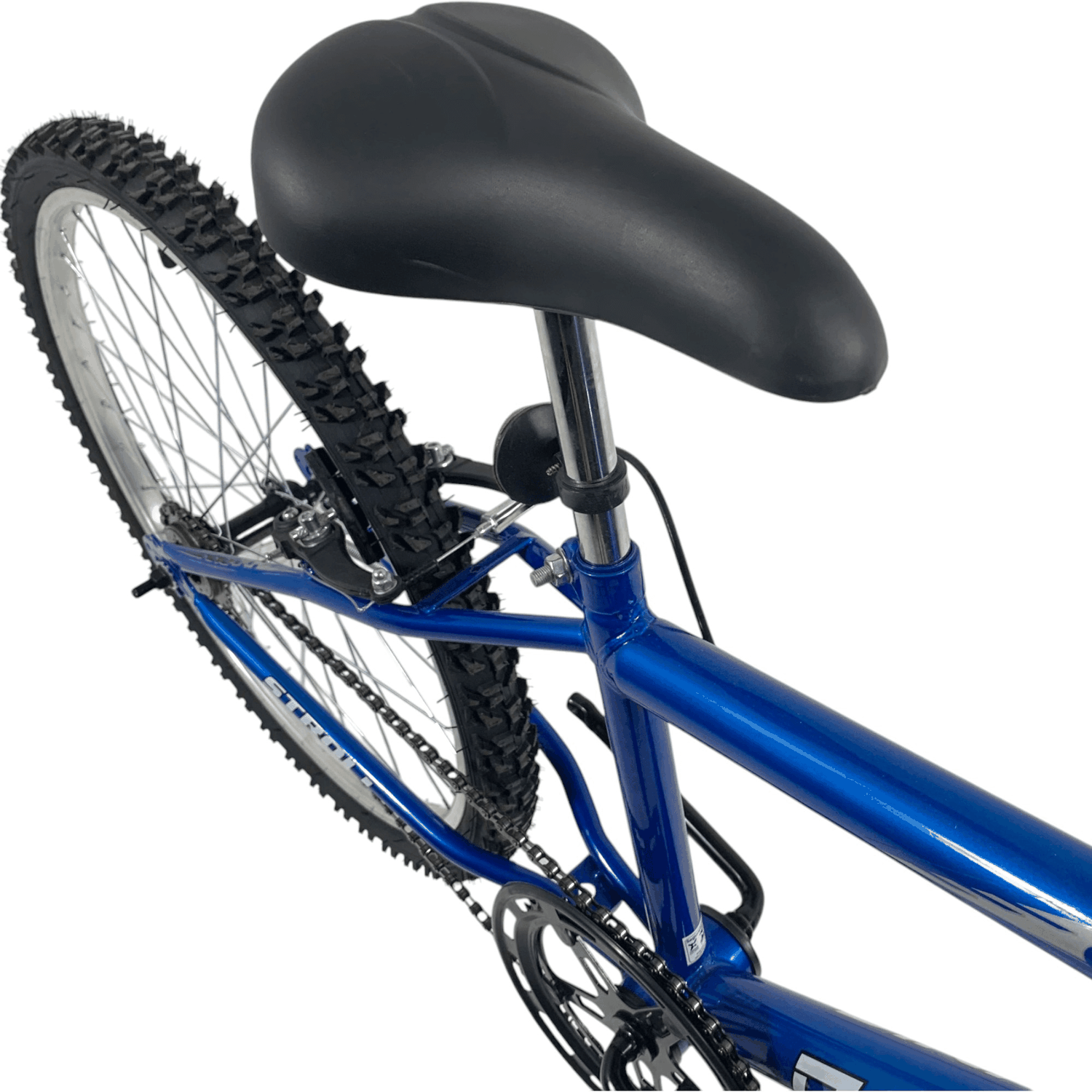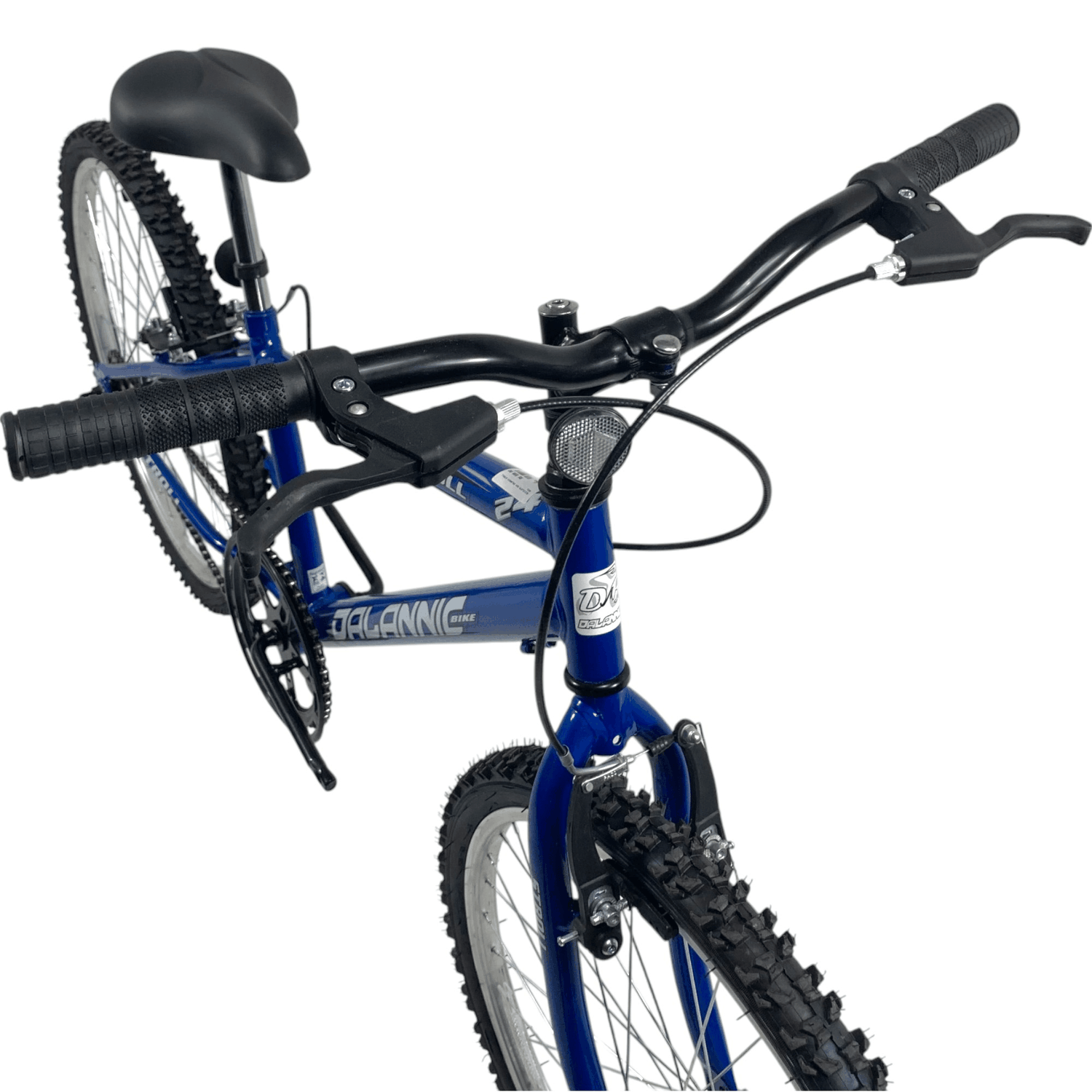 Com aros de alumínio e pneus de 24 polegadas com câmaras de ar, o modelo oferece leveza e desempenho, enquanto o acabamento em azul confere um visual elegante e atrativo.
