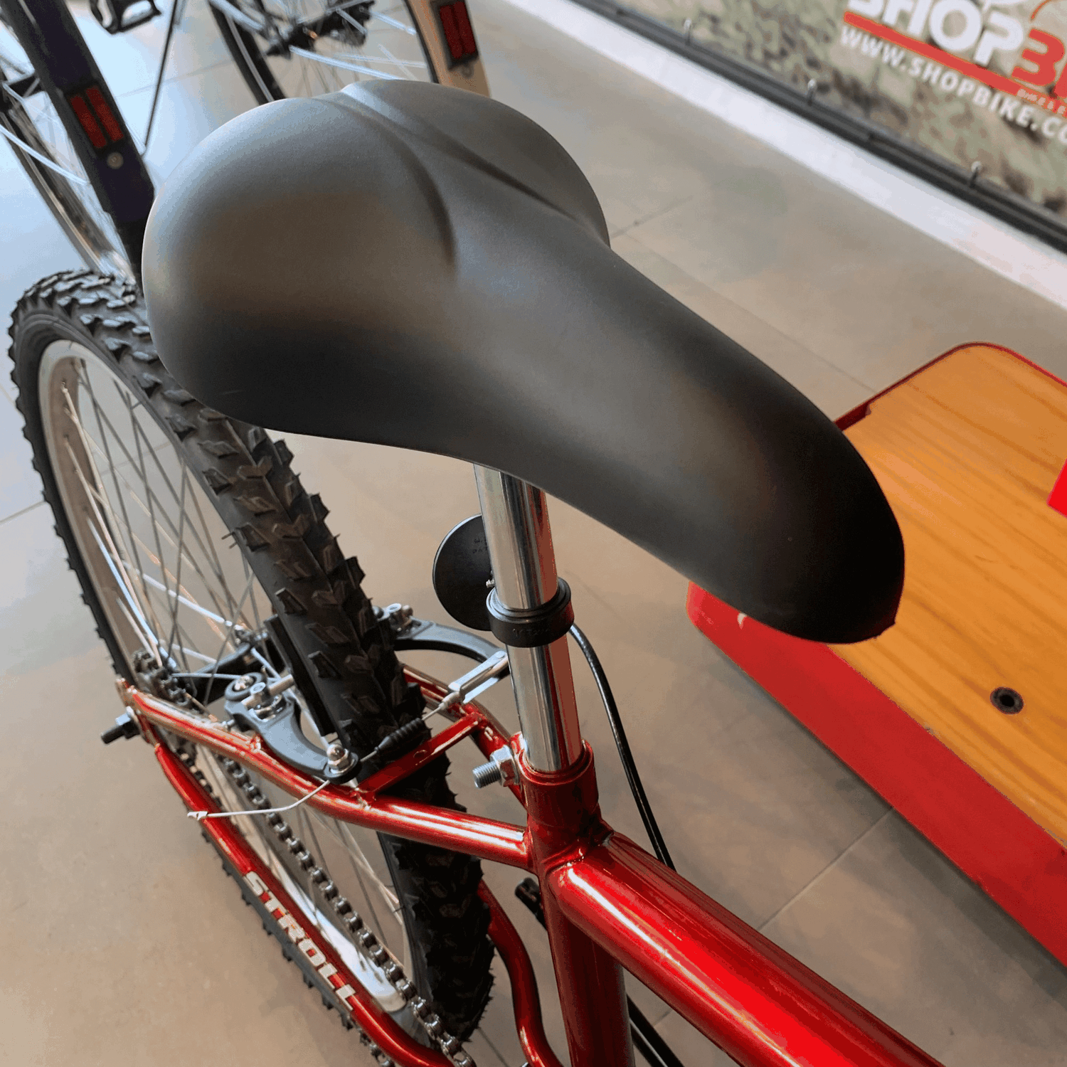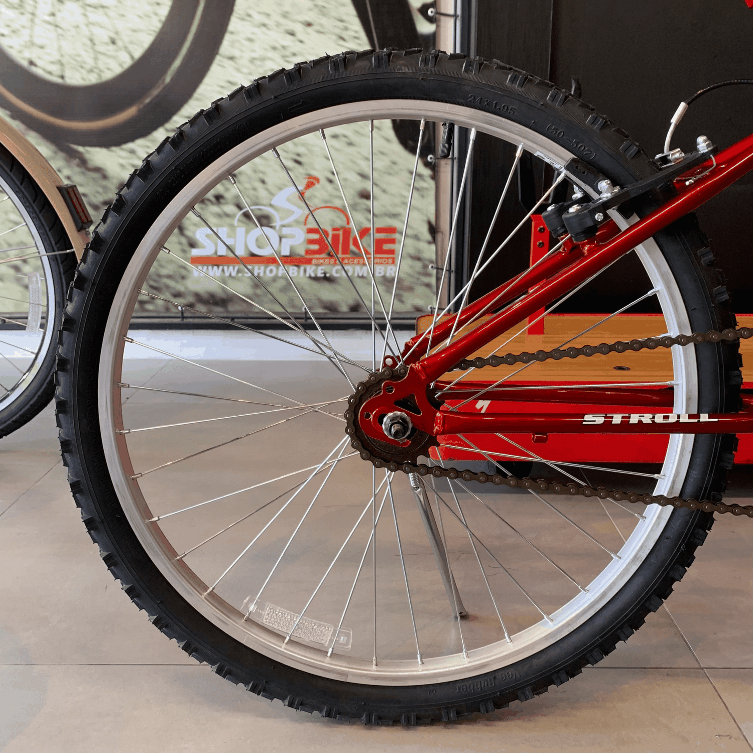 Com um acabamento em vermelho vibrante, a Dalannio Stroll Aro 24 combina design moderno com a praticidade de seus componentes leves, como os aros de alumínio.