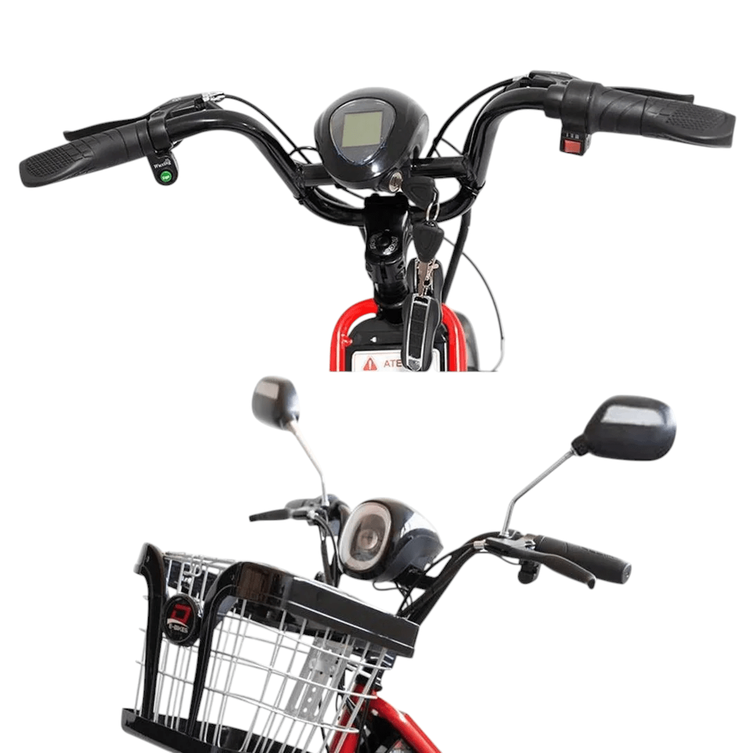 O modelo Full oferece um pacote completo de acessórios: bagageiro, cesta, velocímetro digital, farol de LED, retrovisores, buzina, trava de roda e alarme antifurto com controle remoto. Tudo isso em uma bicicleta robusta, eficiente e com acabamento vermelho que chama atenção por onde passa.
