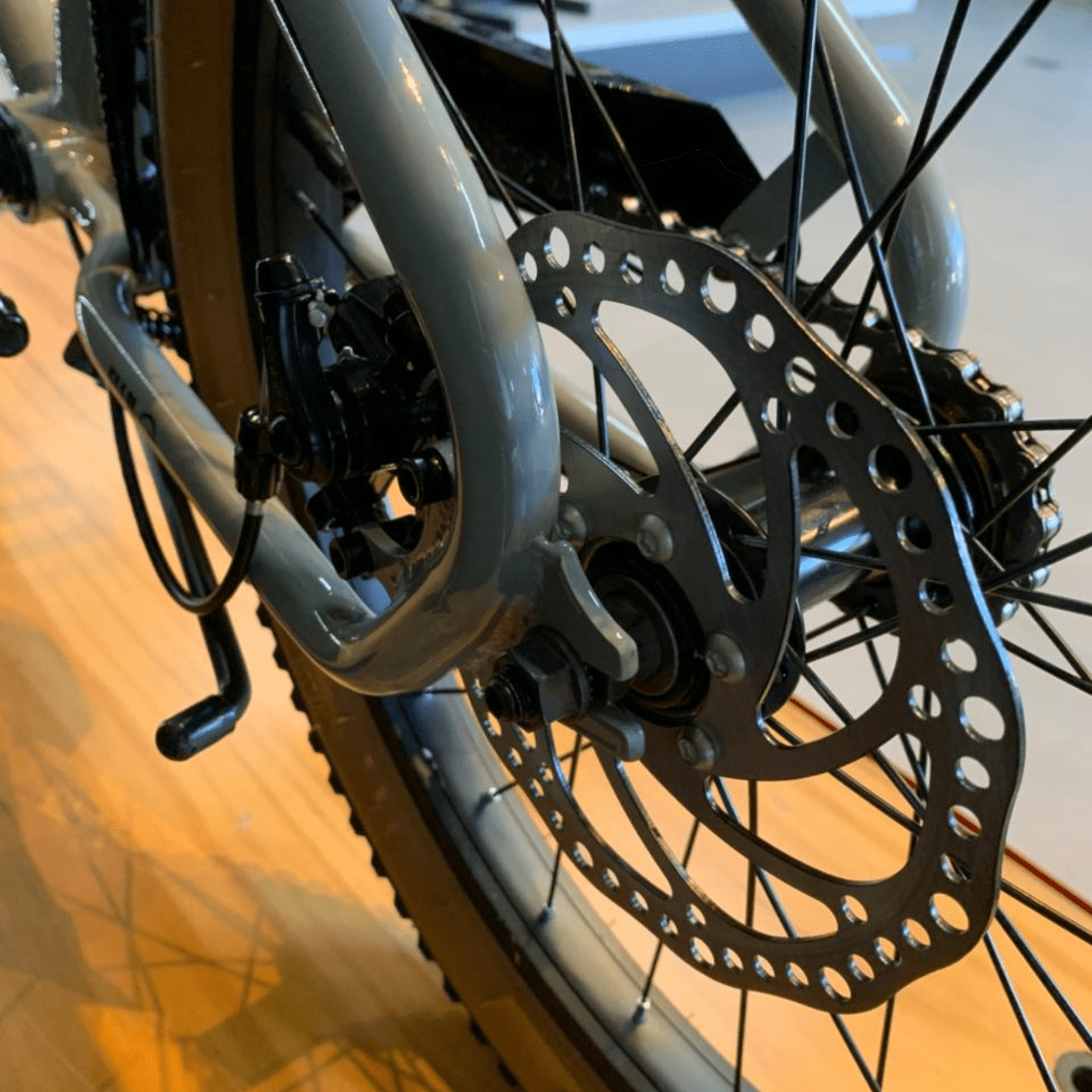 Freio a disco mecânico com rotor de 160 mm e 6 parafusos;