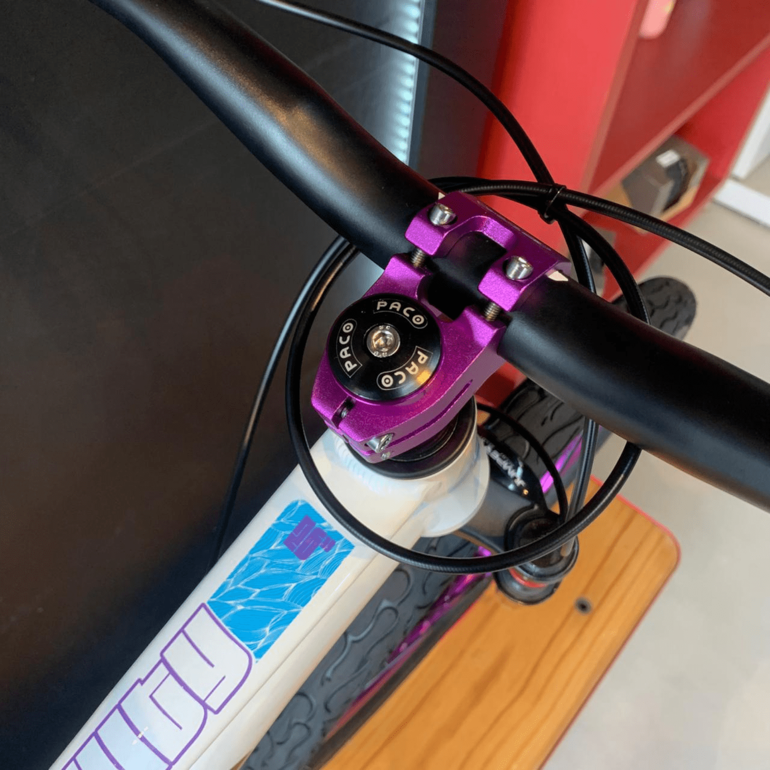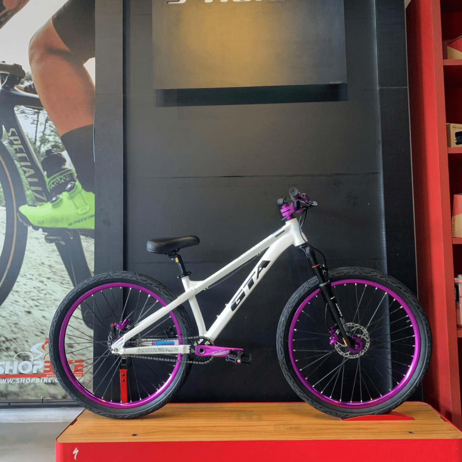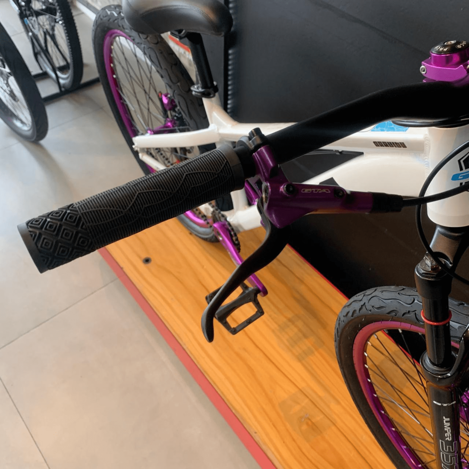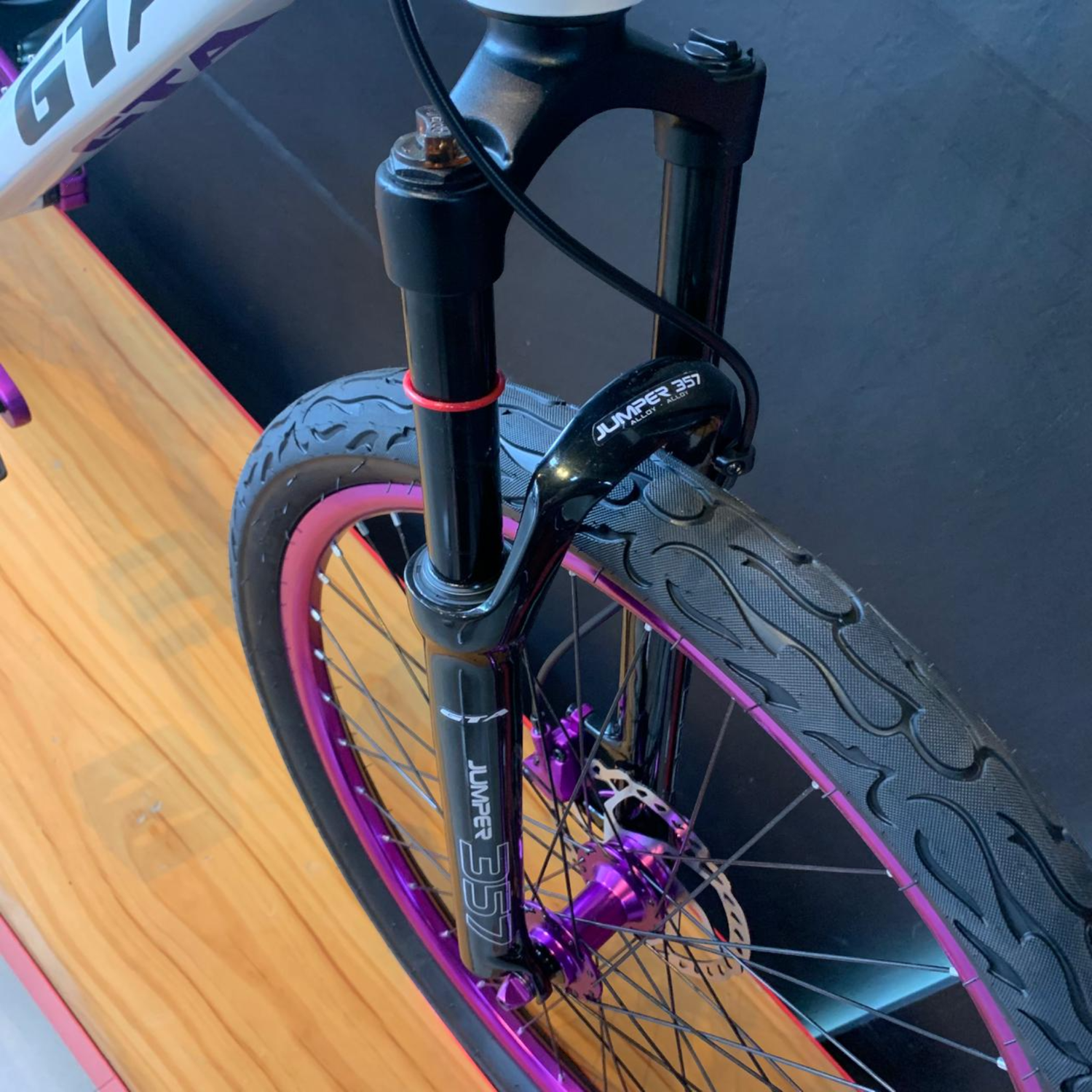 O sistema de frenagem conta com freios GTA e rotores de 160mm, garantindo frenagens seguras e progressivas, mesmo em situações de maior exigência. As rodas reforçam o visual e a performance do modelo, com cubos GTA roxos, aros em alumínio roxo e pneus Paco Flame, que oferecem boa aderência, resistência ao desgaste e segurança no uso urbano e em pistas de dirt.