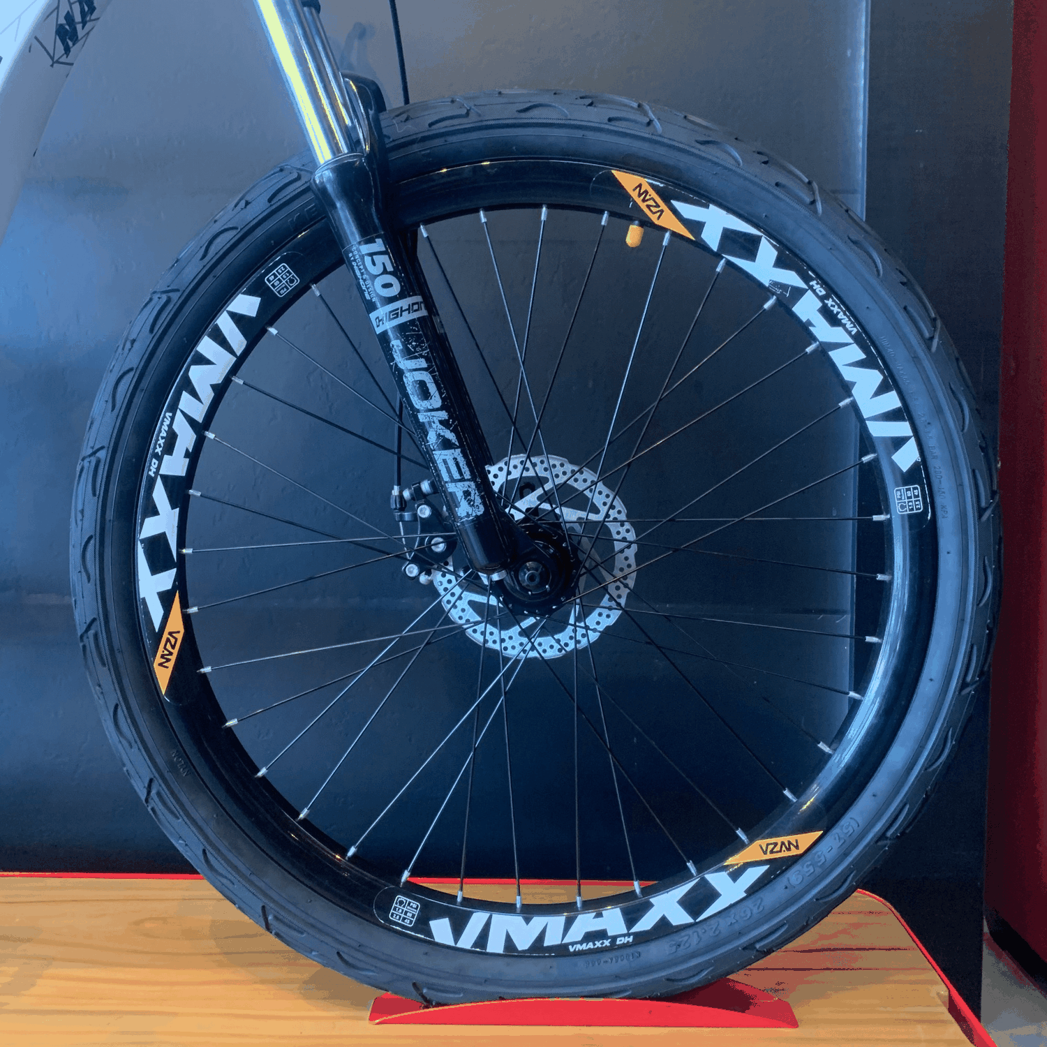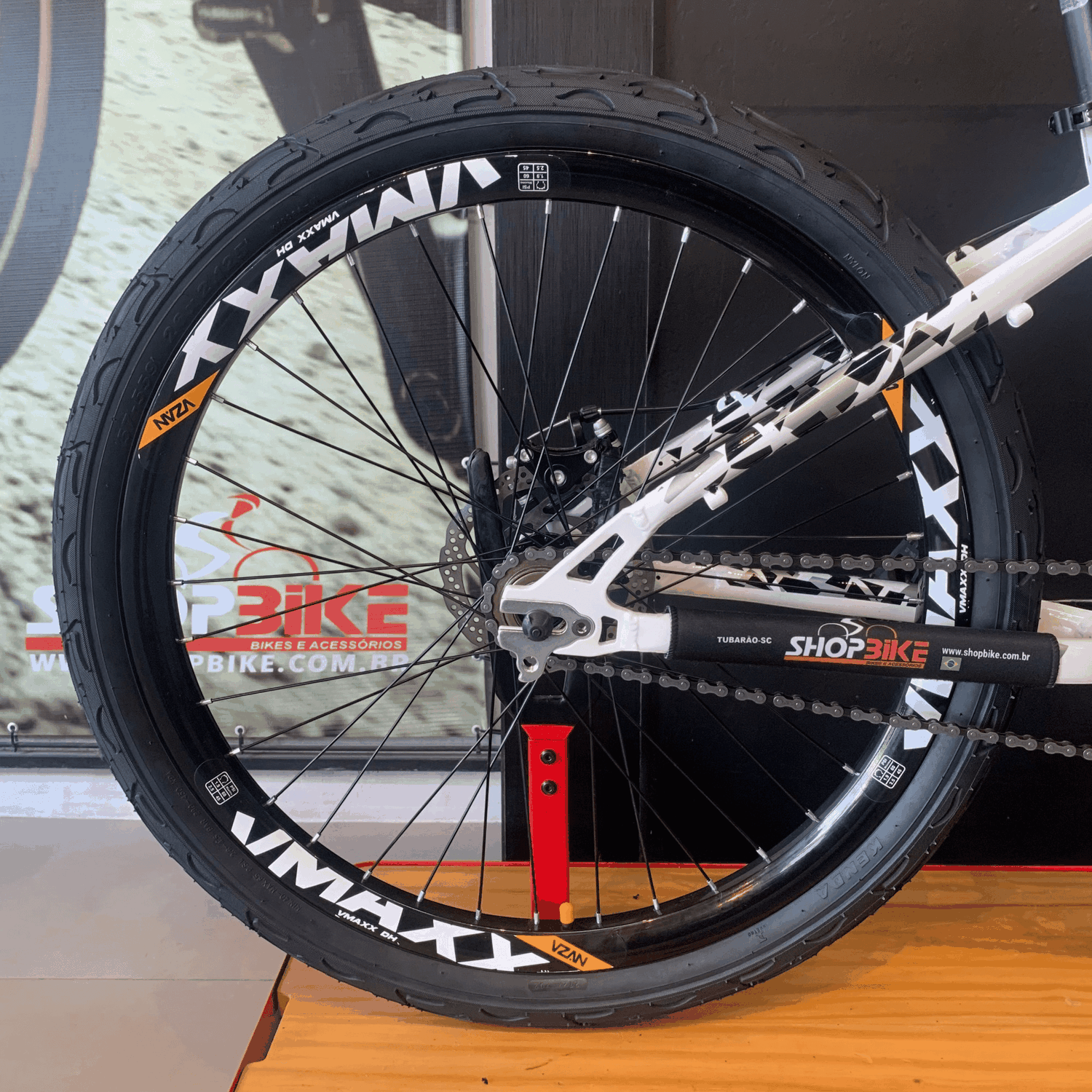 Os aros Vzan Vmaxx LT Disco 26x36F são projetados para máxima resistência, e os pneus Kenda Flame Slick 26x2.125 proporcionam aderência e estabilidade, ideais para diferentes tipos de terreno.