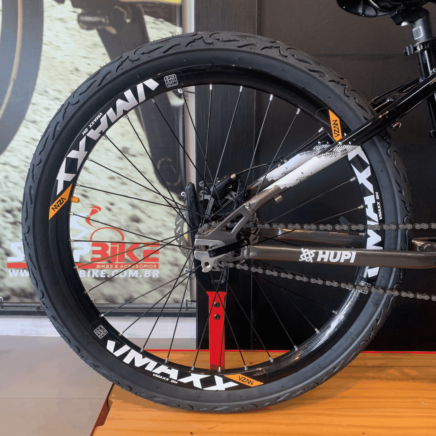 Os aros Vzan Vmaxx 26x32F DH Disco garantem alta resistência, enquanto os cubos WG de alumínio com blocagem oferecem suavidade e segurança na rolagem. Os pneus Paco Flame 26x1.125 proporcionam excelente aderência e conforto para encarar qualquer tipo de terreno.
