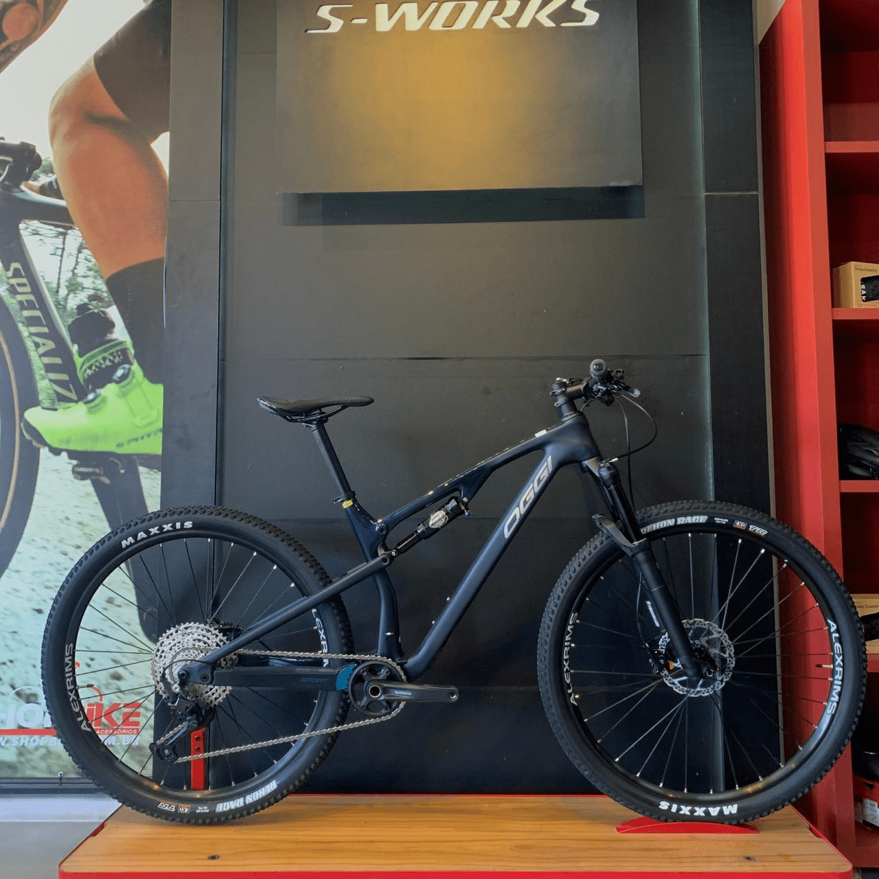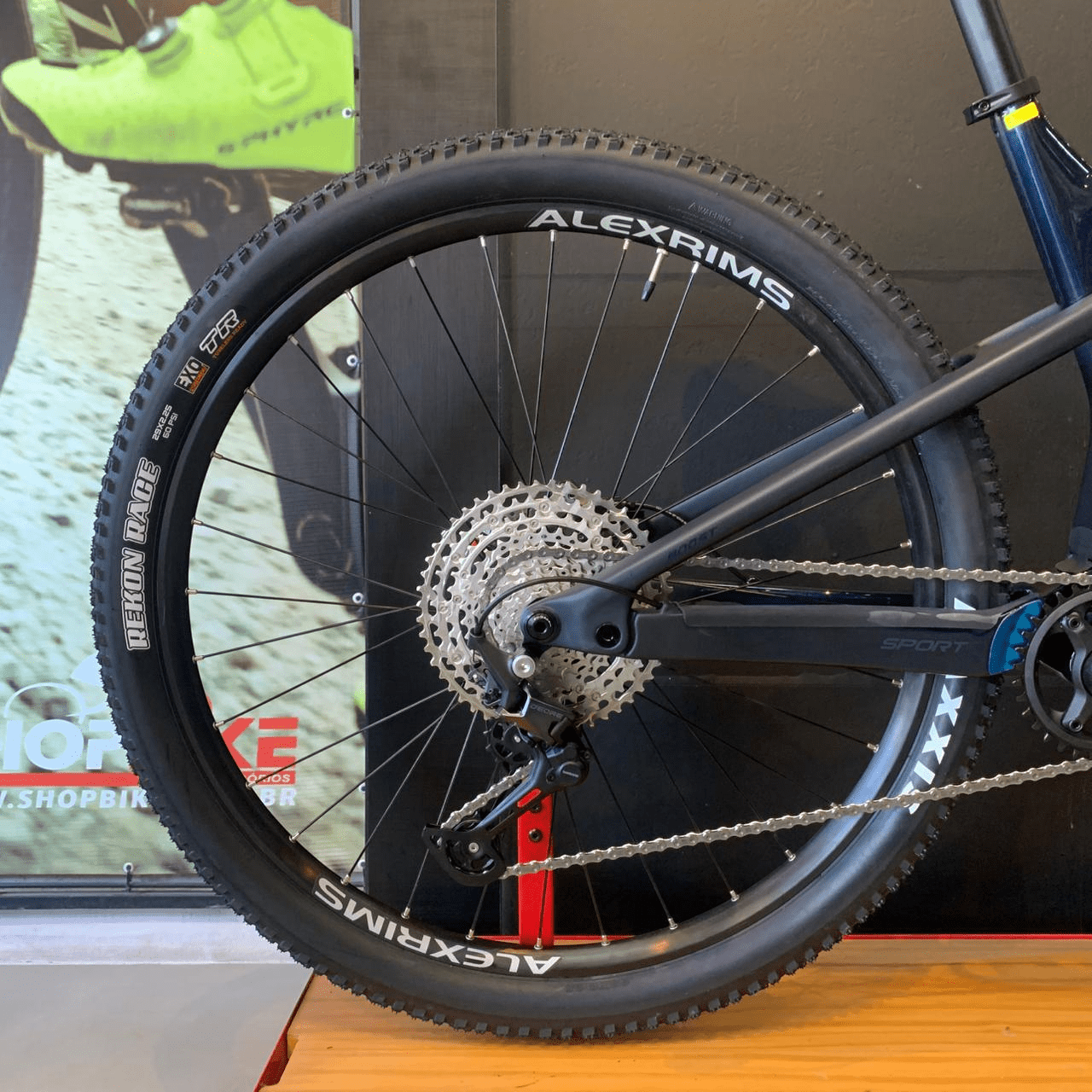 O cockpit assinado pela RaceFace, com guidão de 770mm, mesa e canote em carbono, reforça o conforto e o controle da bike, mantendo o ciclista em posição ideal para longos pedais. Com freios Shimano MT410 e rotores da mesma marca, a frenagem é potente e confiável em qualquer condição climática. As rodas Alexrims com pneus Maxxis completam o conjunto, entregando tração, aderência e durabilidade impressionantes.