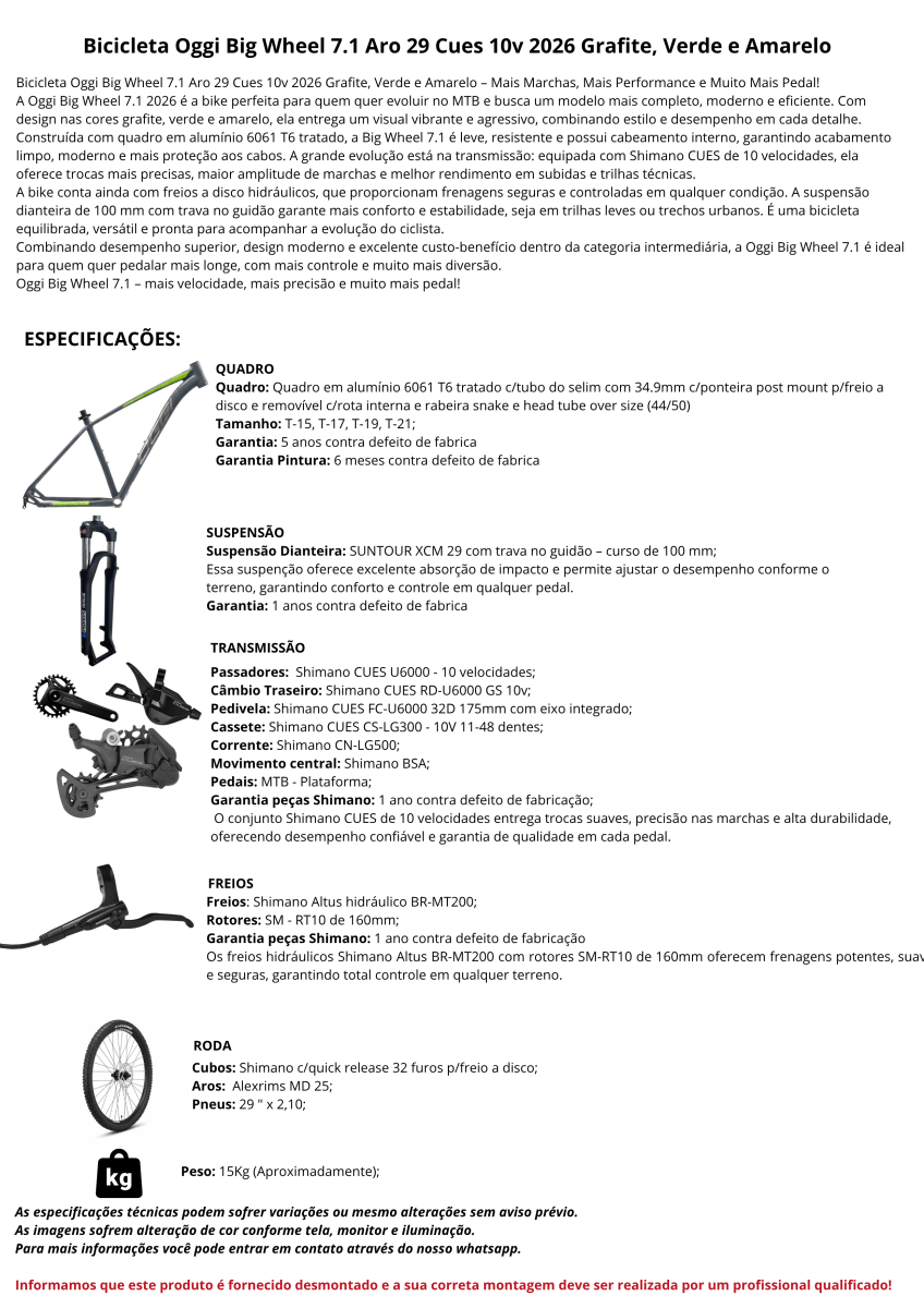 Bicicleta Oggi Big Wheel 7.1 Aro 29 Cues 10v 2026 Grafite, Verde e Amarelo