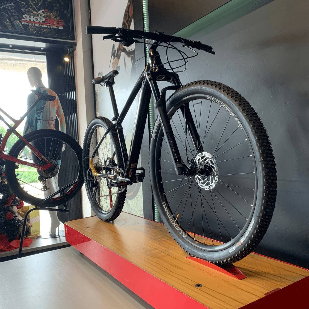 - Quadro: MTB em alumínio 6061 t6 tratado triplo butted p/cambio dianteiro side swing c/ponteria post mount p/eixo traseiro passante (e thru axle 12 x 148 mm) e c/ rota interna dos cabos e cabeçote (head tube) tapered;