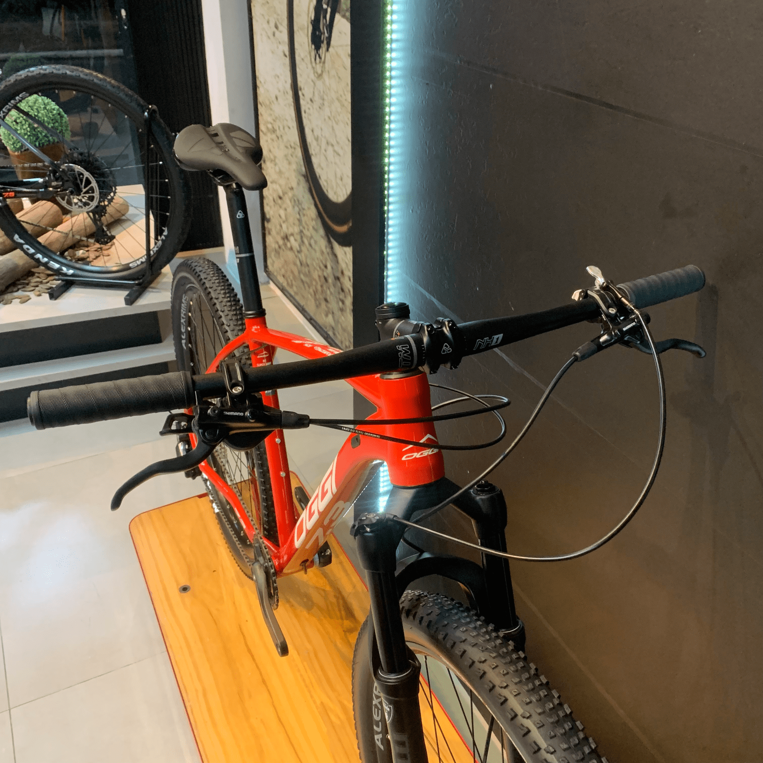 O cockpit ITM NH1 inclui guidão flat de 700 mm, mesa de 90 mm e canote de 400 mm, todos em alumínio, além de um selim Velo 145 mm, proporcionando ergonomia e controle. Os freios Shimano Deore hidráulicos BR-MT410 com rotores SM-RT54S de 160 mm garantem frenagens potentes e seguras. As rodas, equipadas com cubos Shimano MT410 (dianteiro) e TC500-B (traseiro) de 32 furos, aros Alexrims MD 25 e pneus Maxxis 29x2,25, oferecem rolagem suave e aderência em diversos solos.