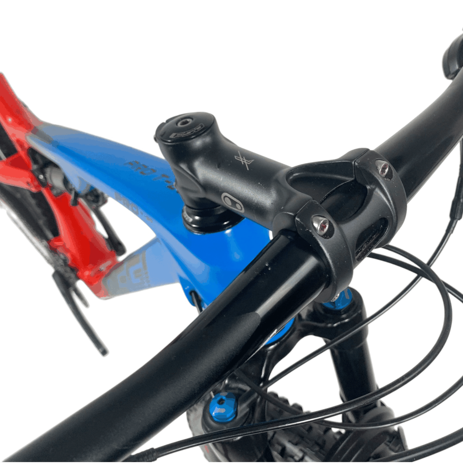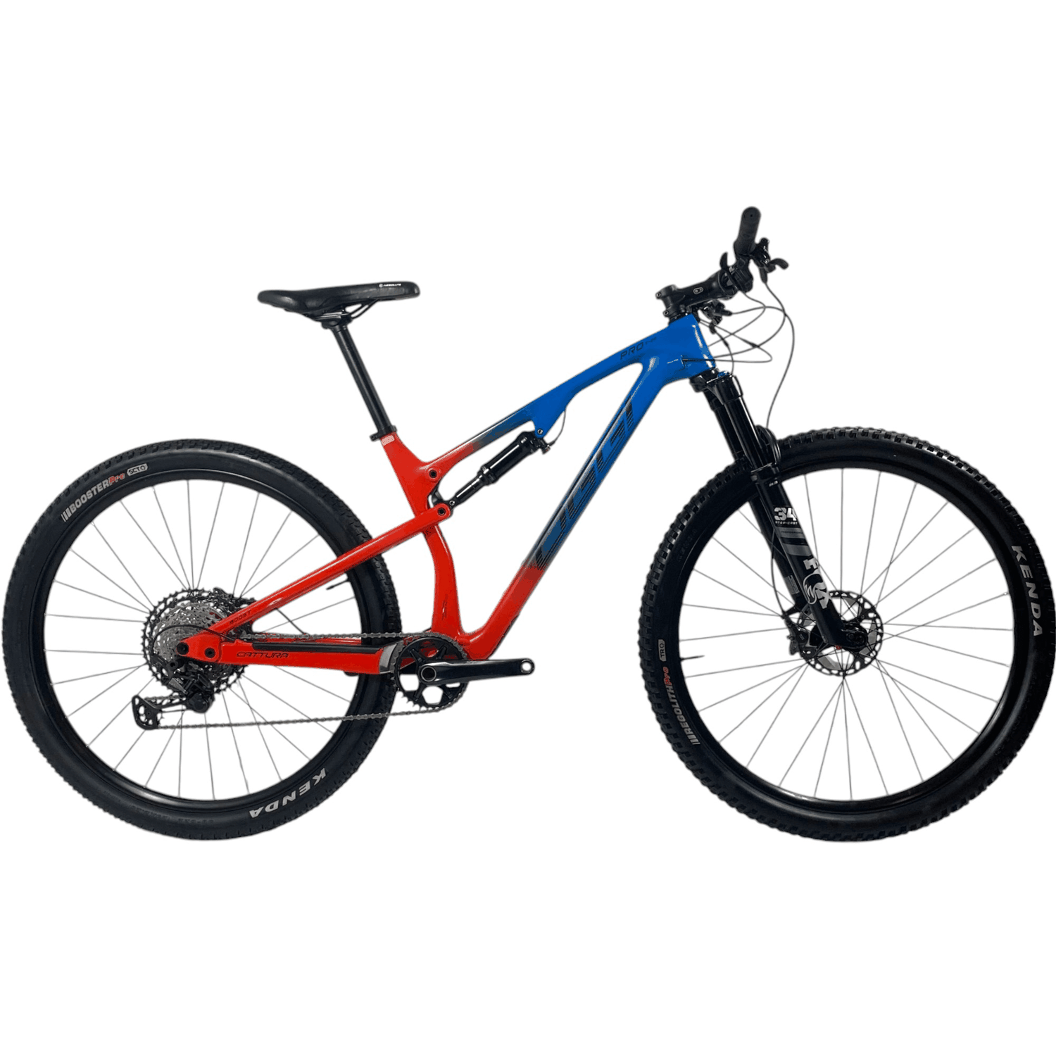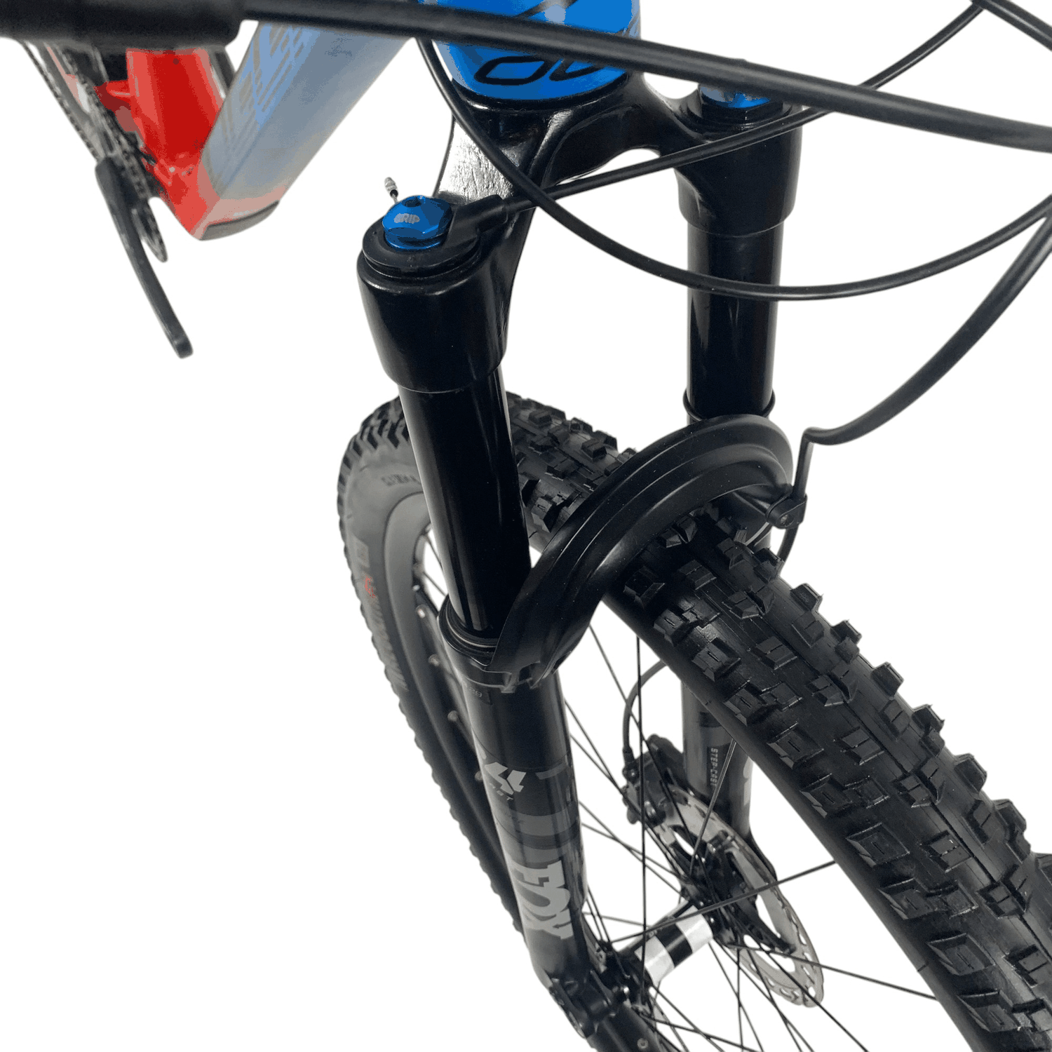 O quadro em carbono Full Suspension Boost proporciona leveza, resistência e absorção de impactos superiores. A suspensão dianteira Fox Float Step Cast 34 com 120mm de curso e a suspensão traseira Fox Float DPS Air, ambas com trava no guidão, oferecem controle total em terrenos acidentados.