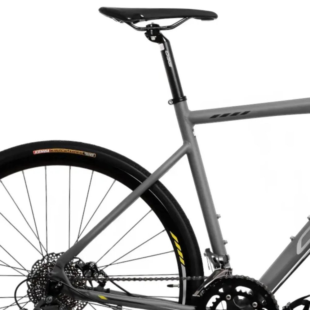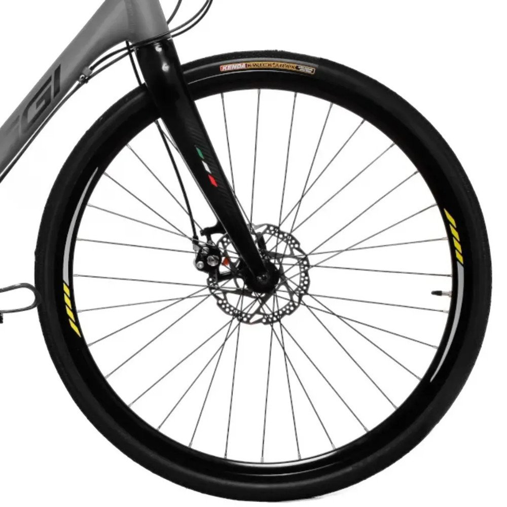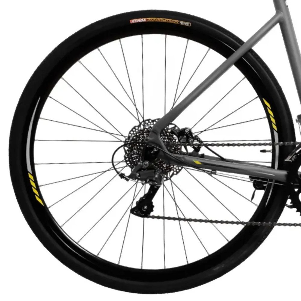 Equipada com cubos Shimano HB-2400 e FH-2400, esta bicicleta oferece uma rodagem suave e confiável. Os aros Aero 700C em alumínio de parede dupla e os pneus Kenda Kwick Trax 700x32C garantem aderência e estabilidade em diferentes tipos de terreno.