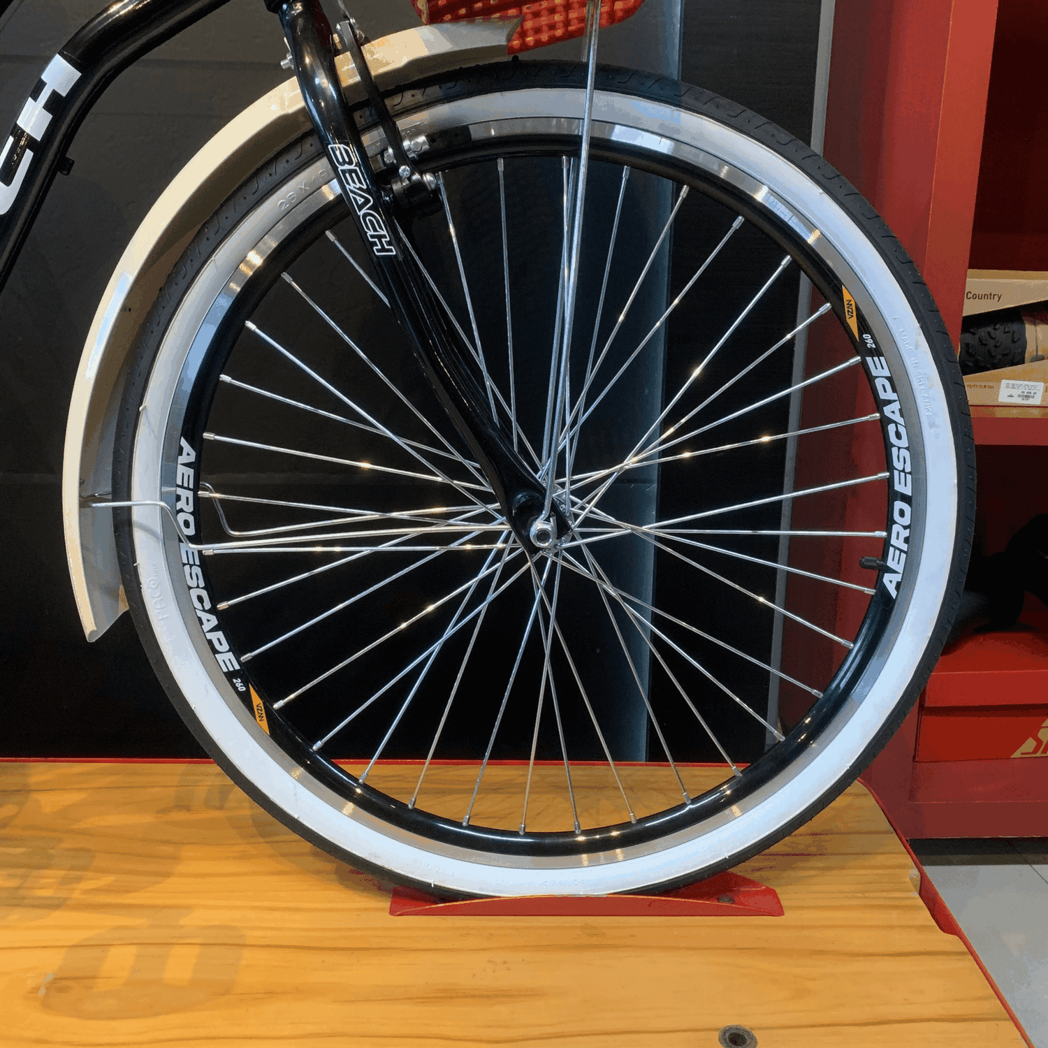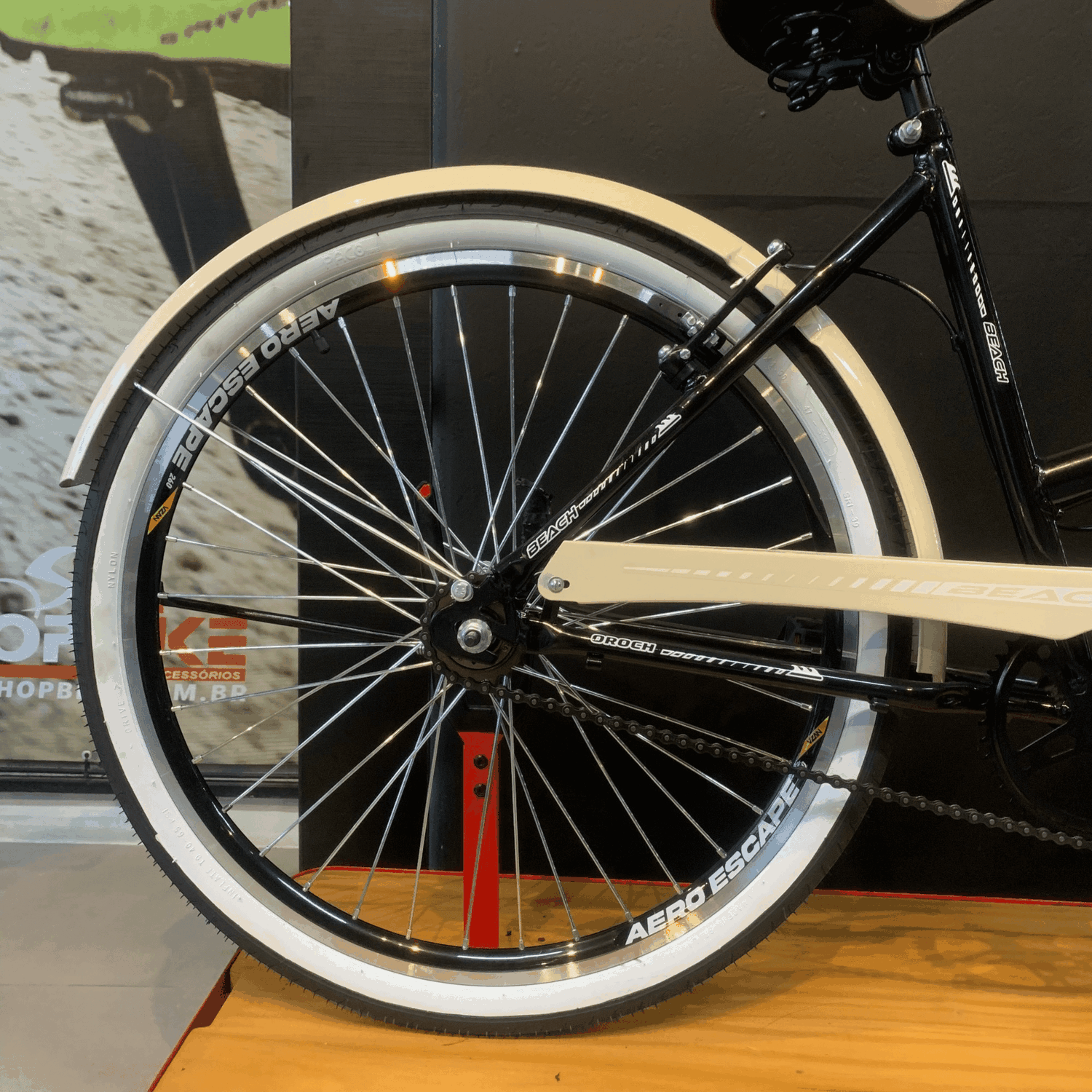As rodas são equipadas com aros Aero Escape Vzan 26 de 36 furos, leves e resistentes, combinados com cubos de 36 furos que suportam o uso diário. Os pneus Paco 26x1,90 oferecem aderência confiável em asfalto, calçadas ou estradas de terra, com cravos leves que garantem versatilidade para passeios recreativos. O estilo beach pode ser complementado por acessórios como cestinha, paralamas ou bagageiro (opcionais, dependendo do revendedor), aumentando a funcionalidade e o charme retrô.
