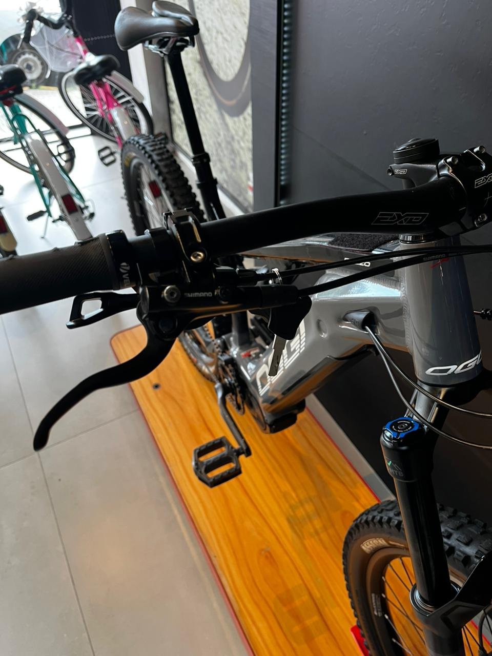 - Freios: Shimano Deore Hidráulico M4100 (4 pistões) com rotores de 203mm.