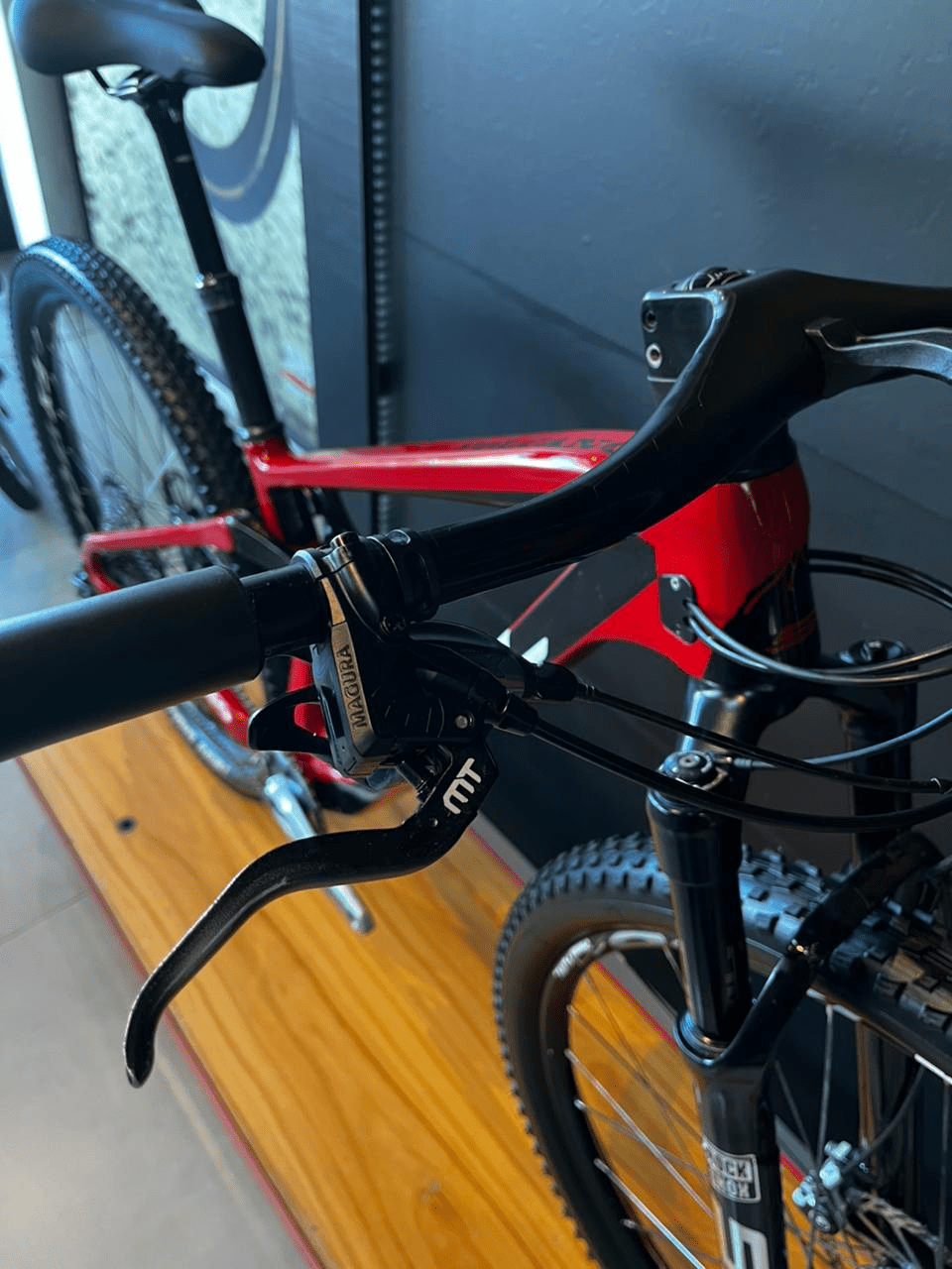 - Freios: Freios a disco hidráulicos (Magura MT4 ou equivalentes) com potência e modulação para trilhas