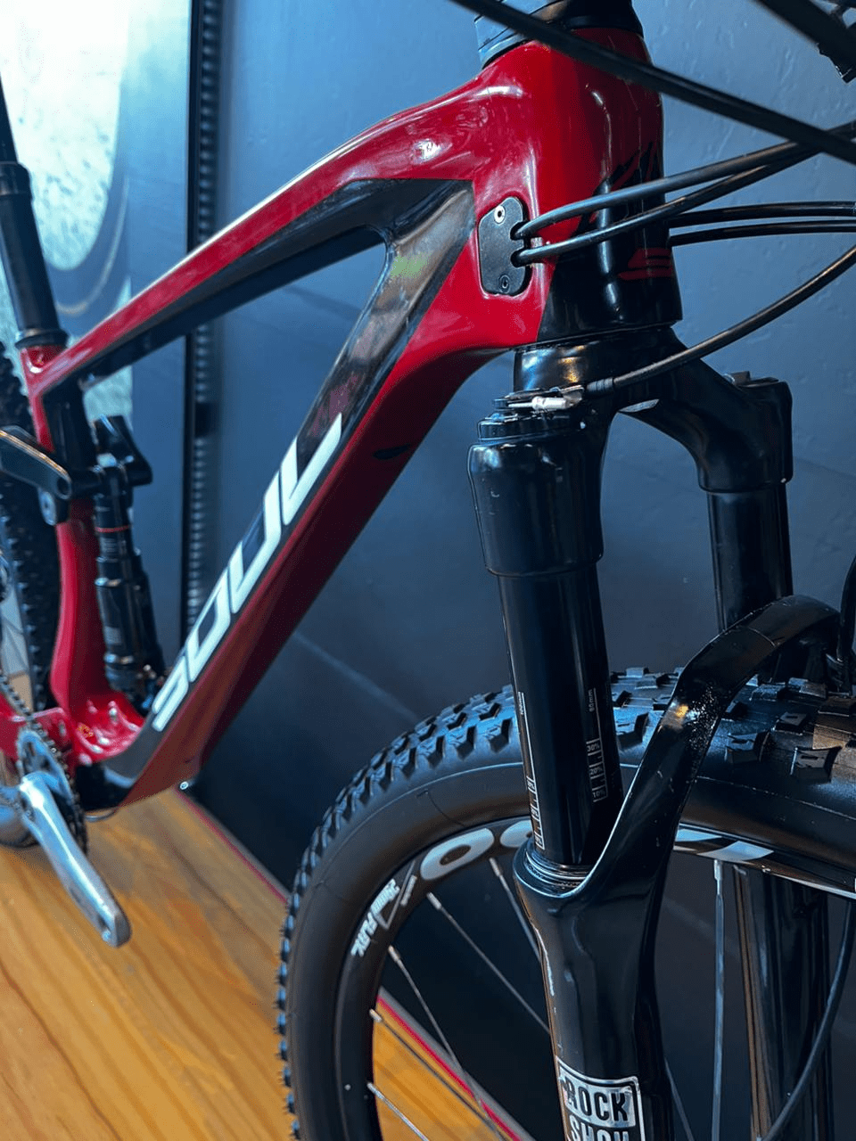 - Quadro: Carbono Soul Volcano, design full suspension com foco em XC/trilhas; cabos internos e geometria moderna para estabilidade e controle;