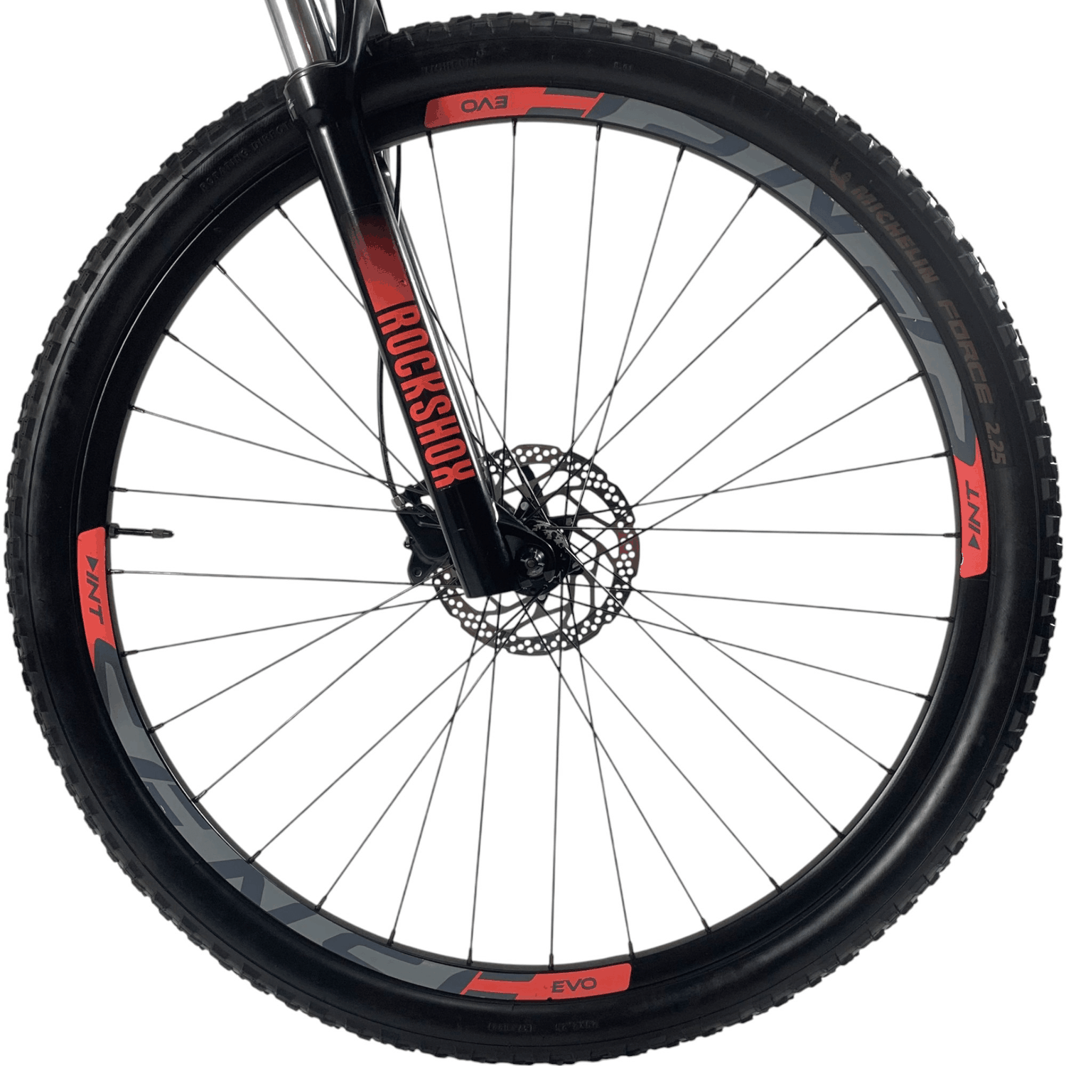 Com cubos Shimano FH-RM35 na traseira e HB-MT200 na dianteira, a bicicleta oferece durabilidade e resistência. Os aros Sense Intense Evo e os pneus Michelin Force 2.25 com pressão recomendada de 26.1 PSI garantem tração e estabilidade em diversos tipos de terreno.