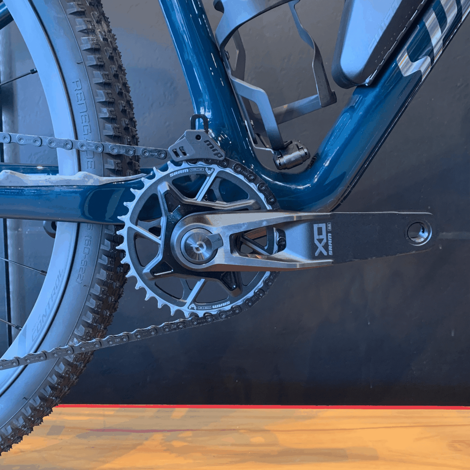 - Pedivela: SRAM X0 Eagle, medidor de potência do eixo Quarq, DUB, 170/175 mm, 34 Dentes;