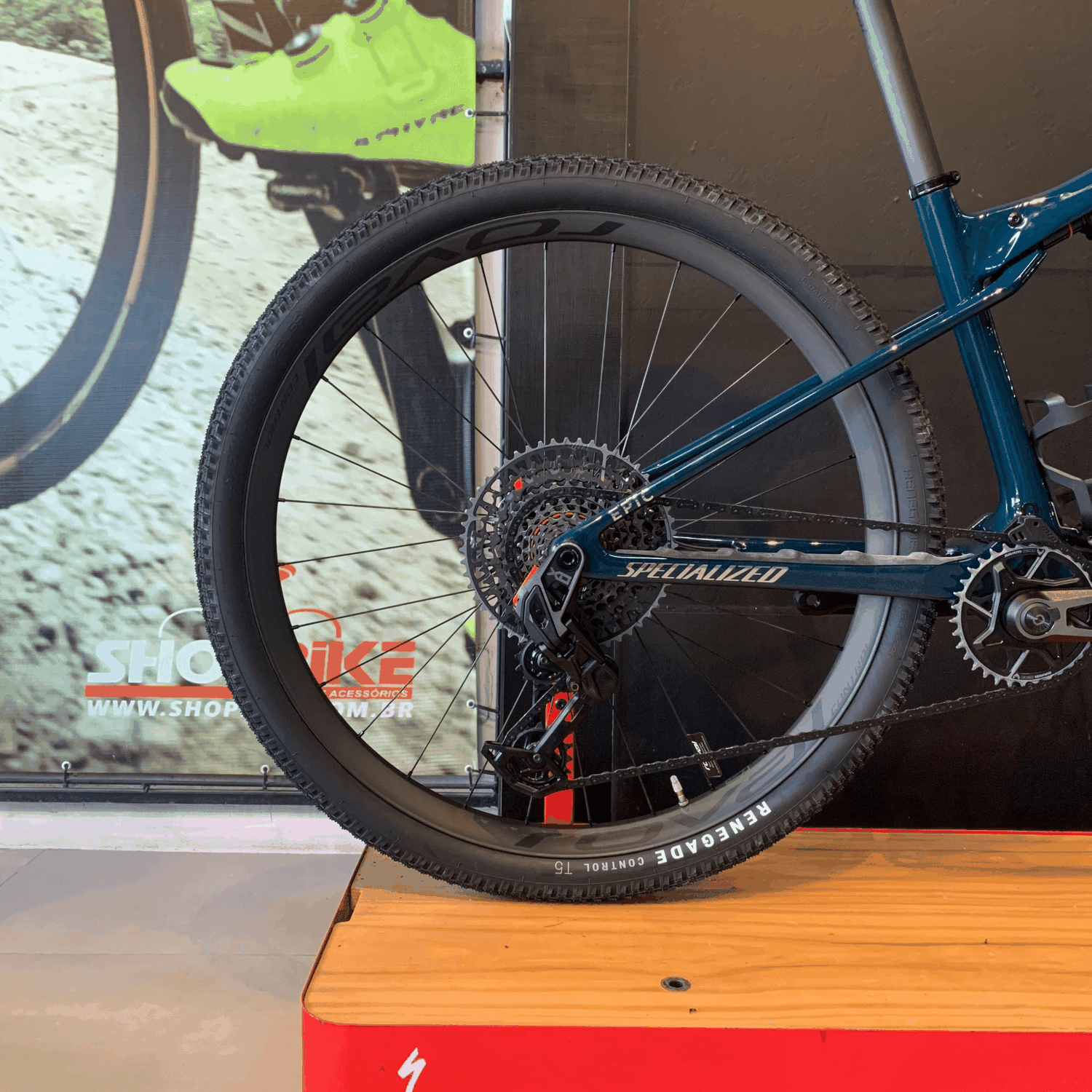 A transmissão SRAM X0 Eagle 12v inclui passadores POD AXS, pedivela com medidor de potência Quarq (170/175mm, 34 dentes), corrente XO Eagle e cassete XS 1295 (10-52 dentes), entregando trocas precisas e potência otimizada. O cockpit com guidão S-Works Carbon XC Mini Rise (760mm), canote Roval Control SL (415/370mm x 30.9) e selim Specialized Geometria Corporal assegura conforto e controle. Os freios SRAM Level Silver com pinça de 2 pistões e rotores de 180mm (dianteiro) e 160mm (traseiro) oferecem frenagem potente. As rodas Roval Control com cubos DT Swiss 350, aros de 29mm de largura interna e pneus Specialized Fast Trak (dianteiro) e Renegade (traseiro) em 29x2.35 garantem tração e durabilidade.