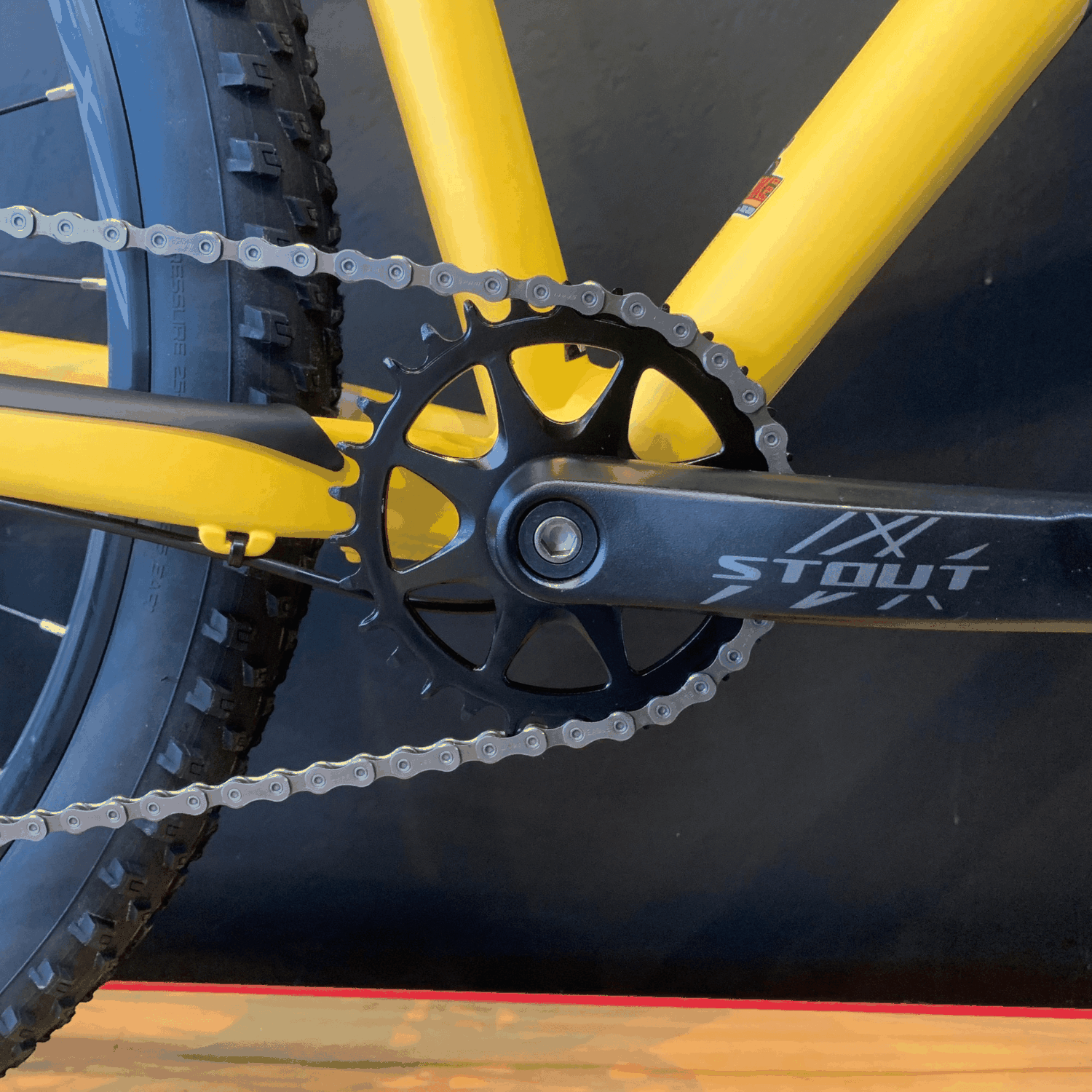 Os pneus Fast Trak Sport 29x2,35 oferecem excelente tração e aderência, enquanto os componentes Stout completam a bicicleta com ergonomia e resistência.