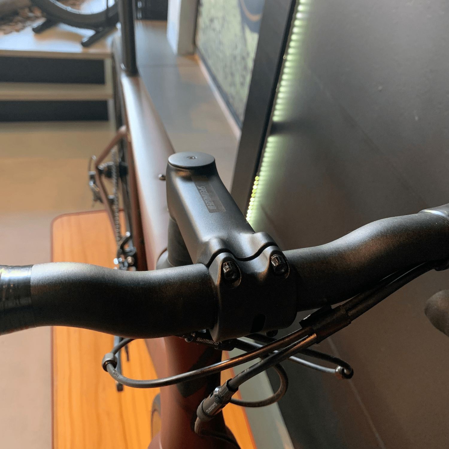 No cockpit, o guidão de alumínio 460mm com mesa Specialized 110mm garante controle firme e postura equilibrada. O canote S-Works e o selim Specialized 150mm oferecem ergonomia, reduzindo pontos de pressão em pedais prolongados.