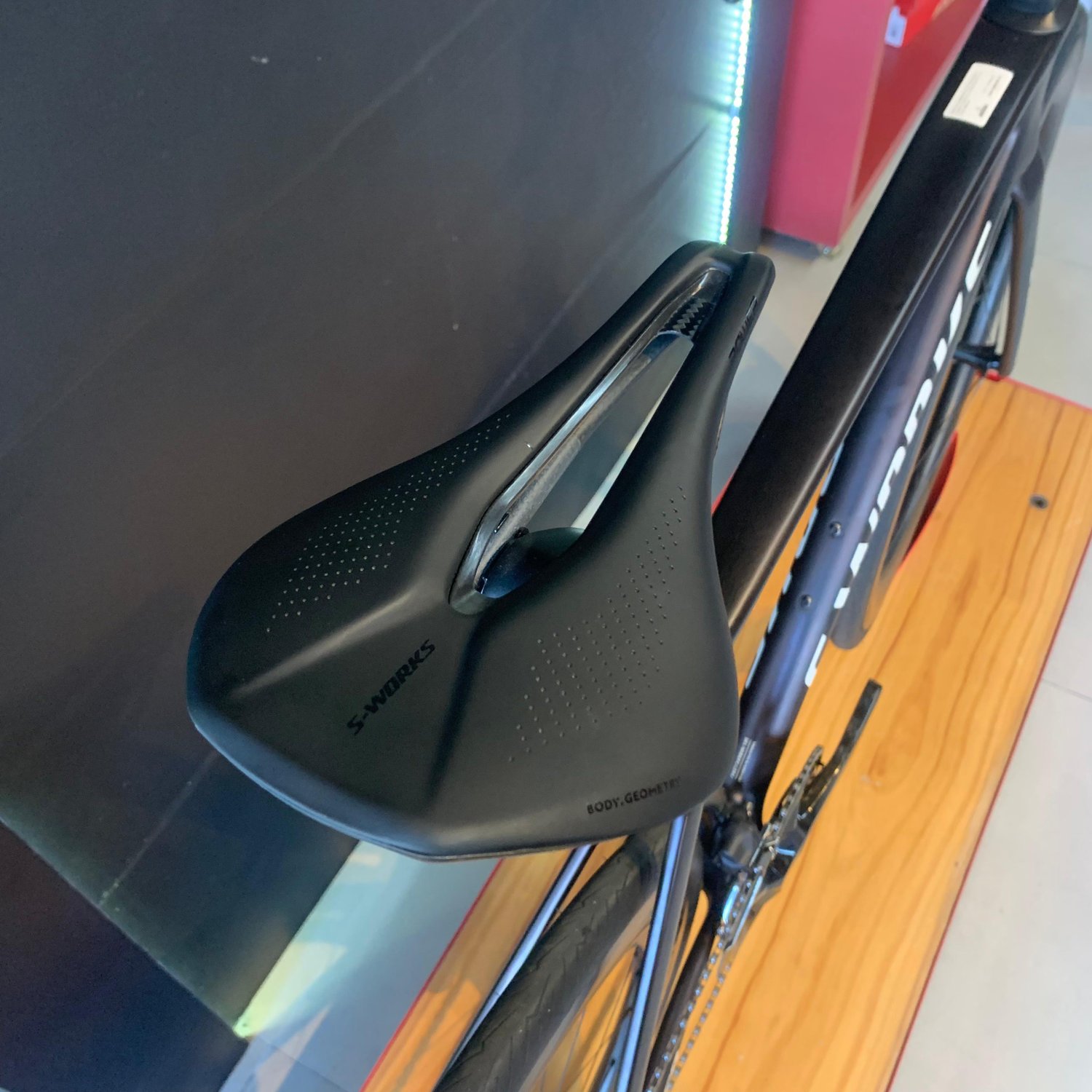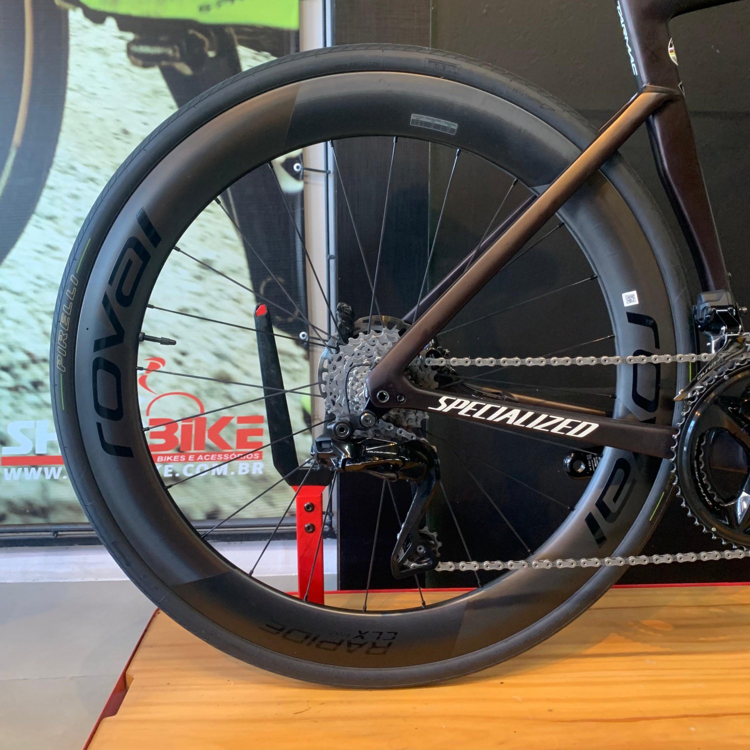 No cockpit, a bike conta com componentes de ponta: guidão Roval 450mm, mesa S-Works 140mm e selim S-Works Power 160mm, oferecendo ergonomia e controle superiores. As rodas Roval aro 700, aliadas aos pneus Pirelli de alta performance, garantem rolagem suave, aderência e durabilidade. Pesando cerca de 7,5 kg, essa bike é referência em leveza e rendimento.