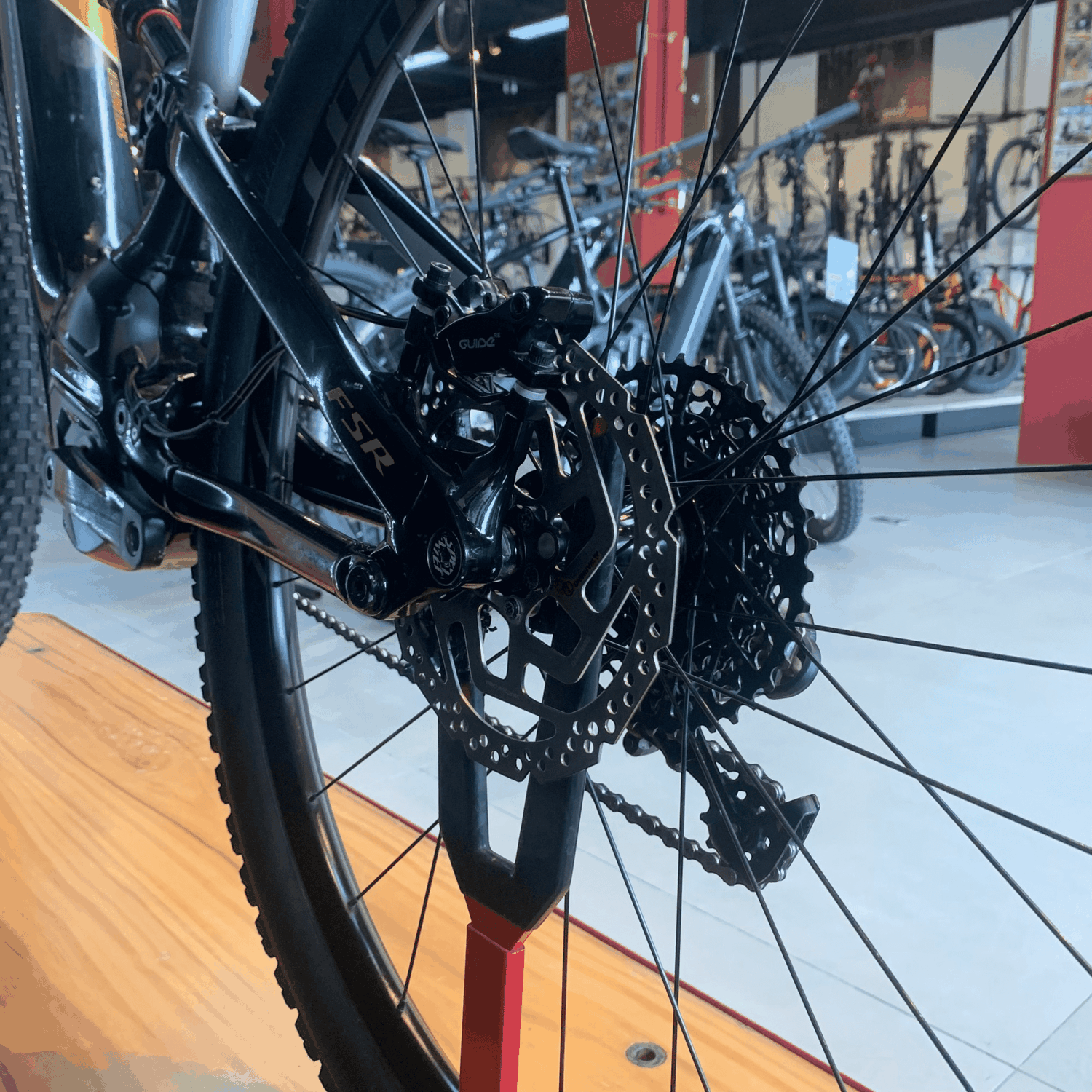 Para máxima segurança, a Specialized Levo conta com freios SRAM Guide e rotores Shimano de 180mm, além de rodas 29” Stout com pneus Ground Control, ideais para enfrentar obstáculos com confiança. O cockpit é composto por guidão de 790mm, mesa Specialized de 557mm e canote em alumínio, entregando firmeza e controle ao pilotar.