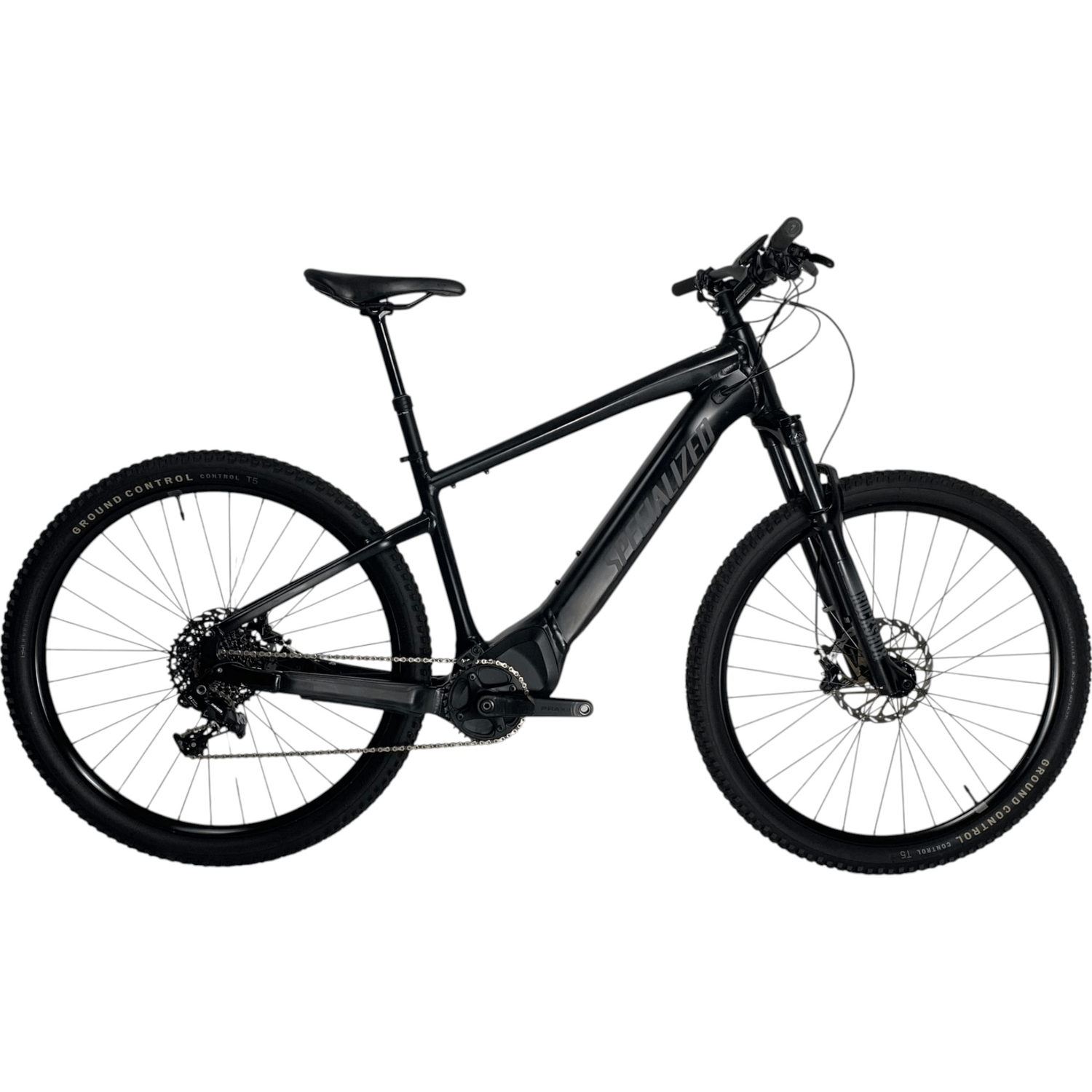 As rodas possuem cubos de 15x110 mm (dianteiro) e 12x148 mm (traseiro), ambos com 32 furos, aros 29 de 32 furos e pneus Ground Control T5 29x2,35, entregando tração superior. O sistema elétrico inclui o motor Specialized 2.0 de 70 Nm e 250 W, ajustável para personalização, e a bateria U2-710 de 710 Wh com display integrado. O ciclo computador MasterMind TCD, com controle remoto, Bluetooth® e antirroubo, oferece monitoramento detalhado e personalizado. Com peso aproximado de 23 kg, ela é robusta para uma e-bike.