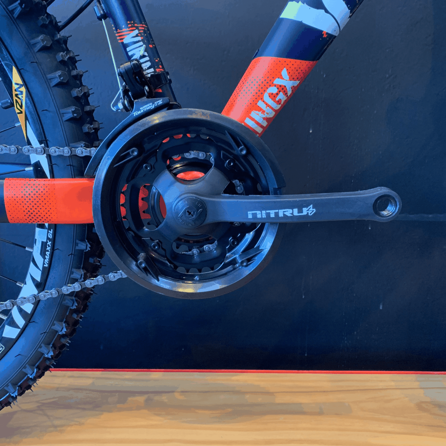 O sistema de transmissão Shimano de 21 velocidades garante trocas de marcha suaves e precisas, com passadores Inviktus (3x7 velocidades), câmbio dianteiro Shimano Tourney TZ (3 velocidades) e câmbio traseiro Shimano (7 velocidades). A coroa tripla de 24/34/42 dentes e o cassete de 7 velocidades (14–28 dentes) oferecem versatilidade para enfrentar subidas íngremes, descidas rápidas ou terrenos planos, enquanto o pedivela Nitrus de 170mm proporciona durabilidade e eficiência em pedais intensos. A corrente indexada para 21 velocidades assegura trocas confiáveis, minimizando desgaste.