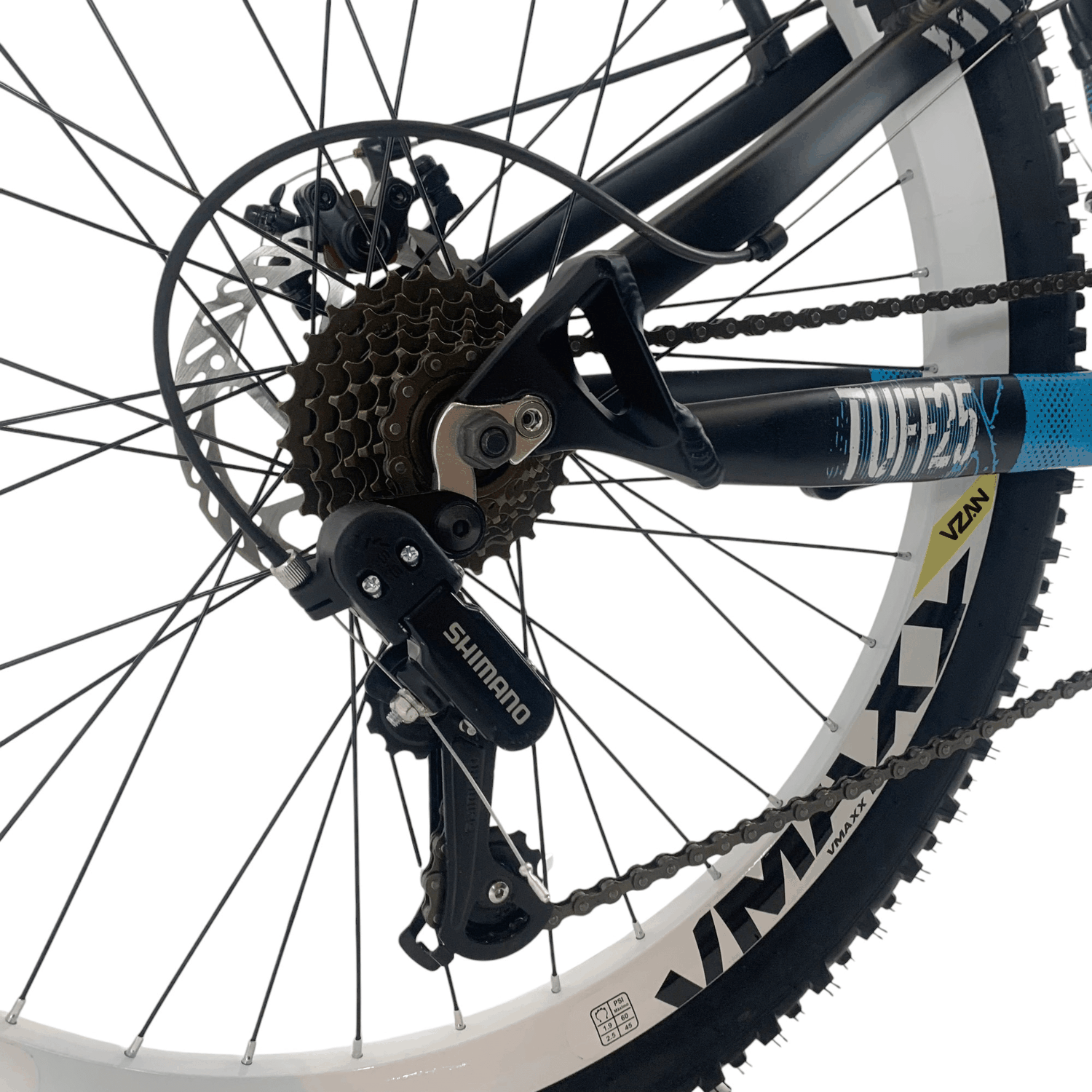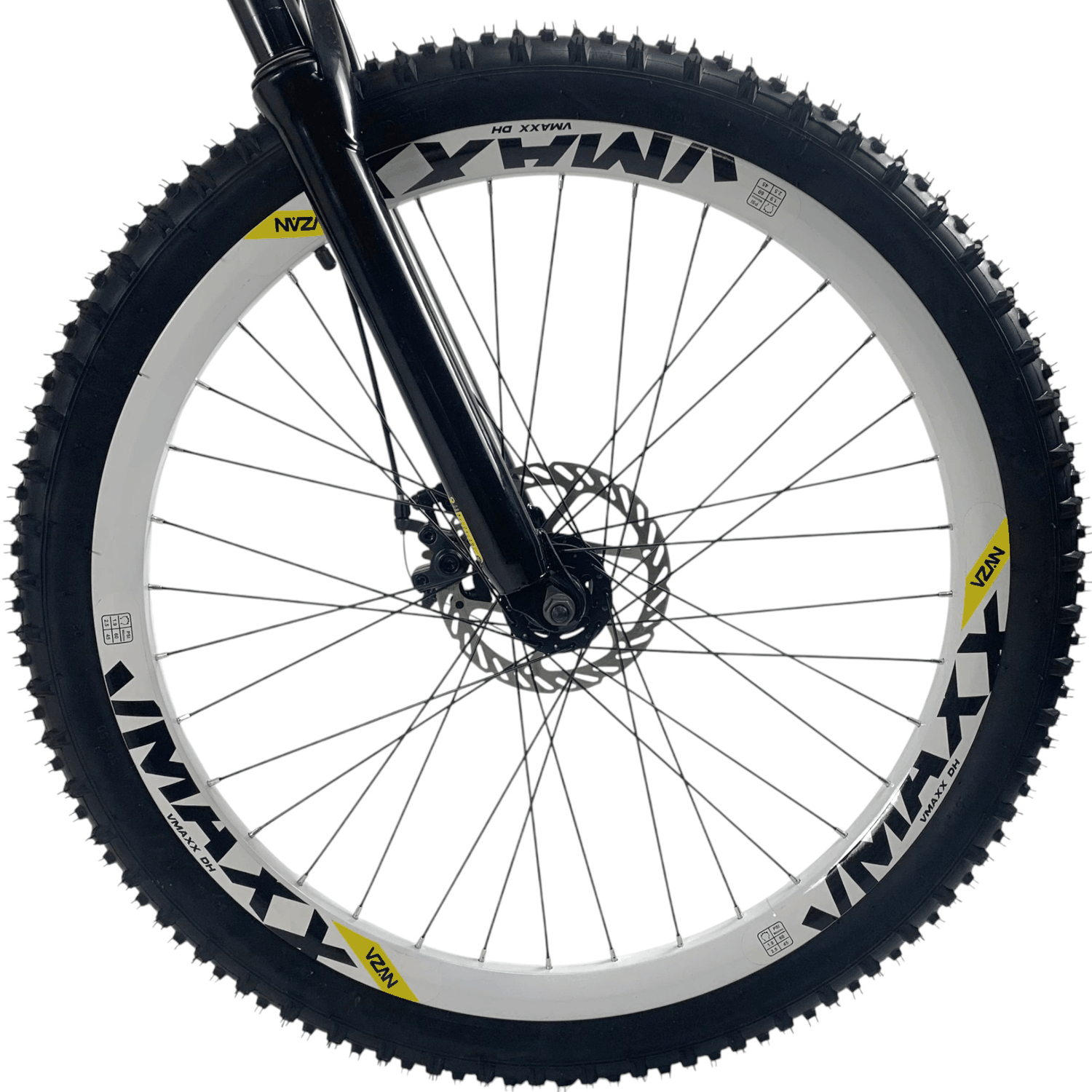 Equipada com aros Vzan Vmaxx DH e cubos de alumínio, a bicicleta oferece durabilidade e resistência. Os pneus DSI 26x2.35 garantem tração e aderência em diversos terrenos, proporcionando estabilidade em suas aventuras.
