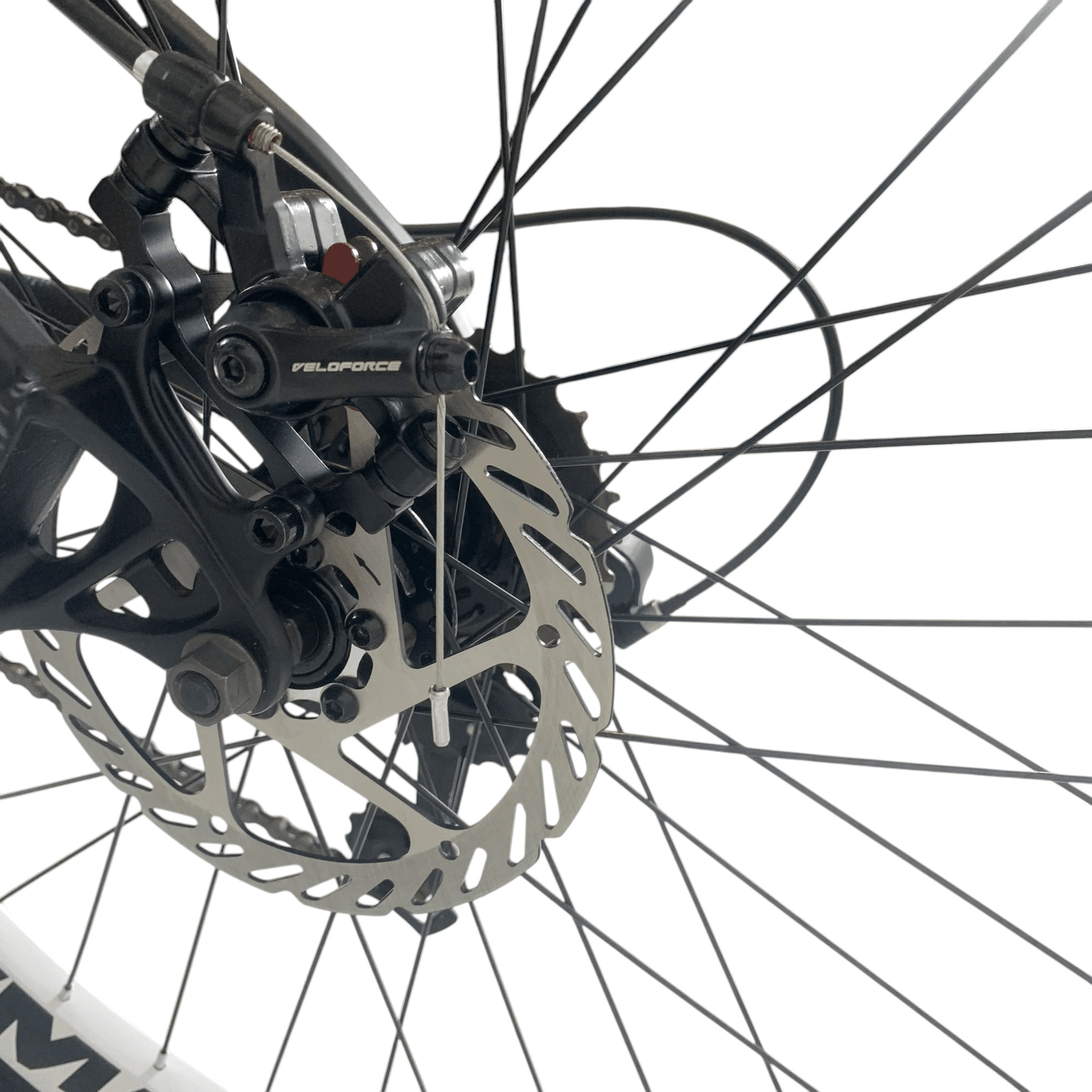 Os freios a disco mecânicos com rotores de 160mm garantem uma frenagem eficiente e segura, oferecendo controle em descidas e condições adversas.
