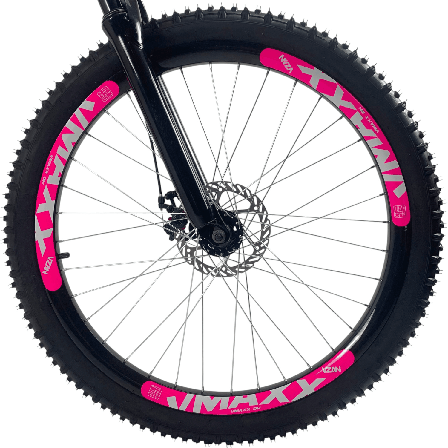 Os aros Vzan Vmaxx DH e os cubos de alumínio oferecem resistência e durabilidade. Os pneus DSI 26x2.35 proporcionam excelente tração e aderência em diferentes tipos de terreno, garantindo estabilidade e segurança em todas as suas aventuras.