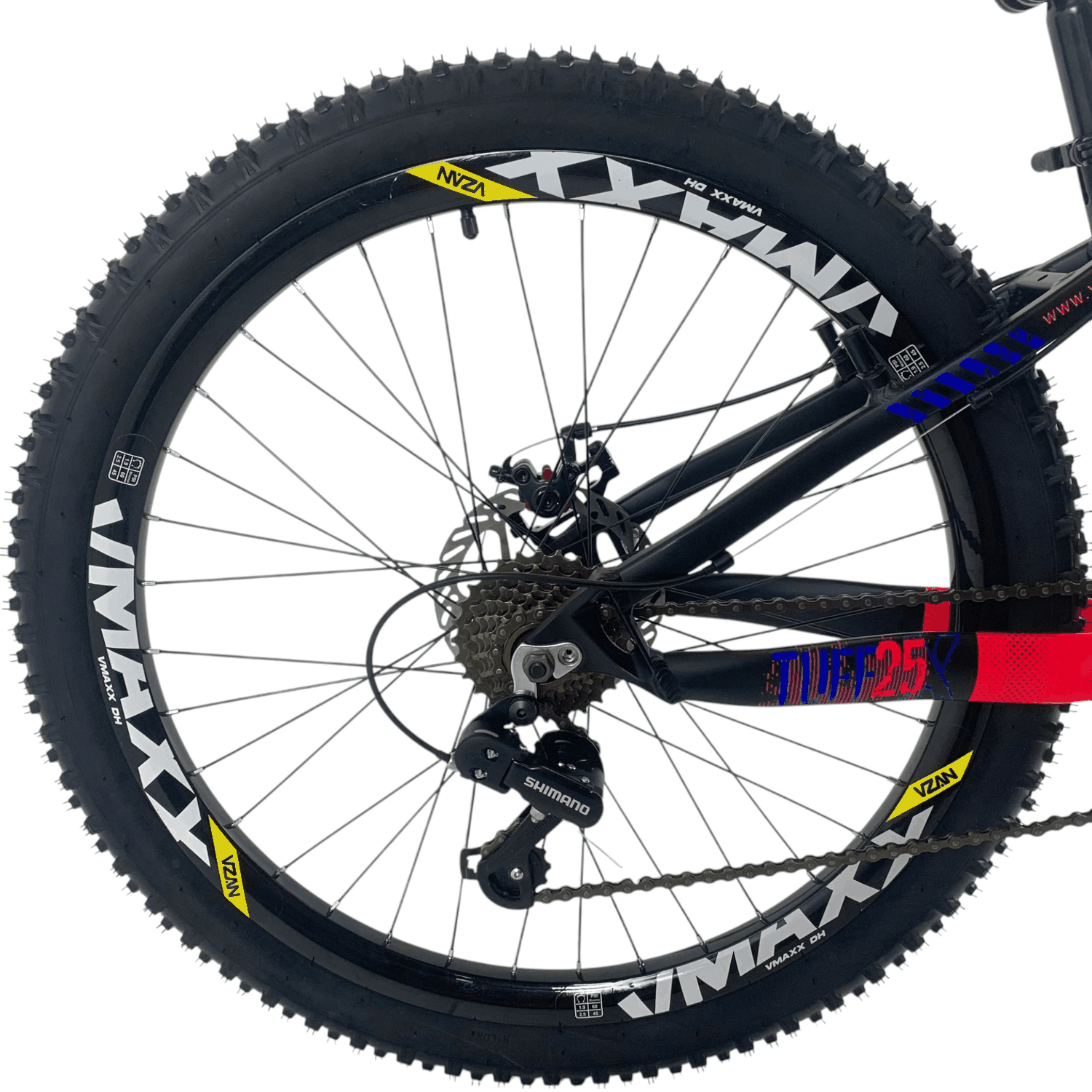 Com aros Vzan Vmaxx DH e cubos de alumínio, a bike oferece resistência e durabilidade. Os pneus DSI 26x2.35 proporcionam excelente tração e aderência, garantindo estabilidade e segurança em trilhas e terrenos acidentados.