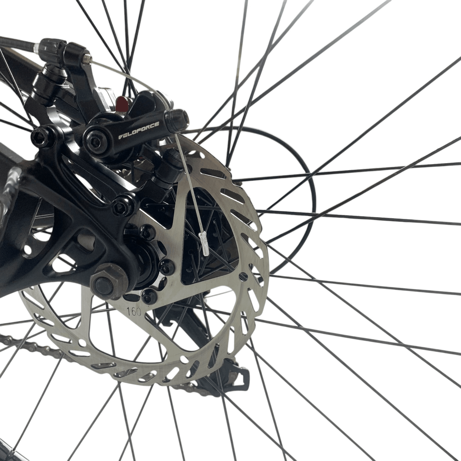 Os freios a disco mecânicos com rotores de 160mm oferecem uma frenagem eficaz e segura, proporcionando total controle, mesmo em descidas íngremes e condições adversas.