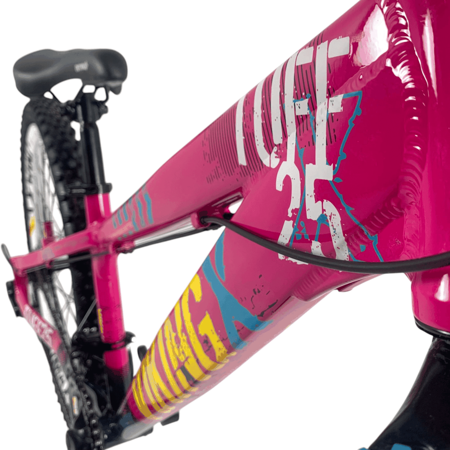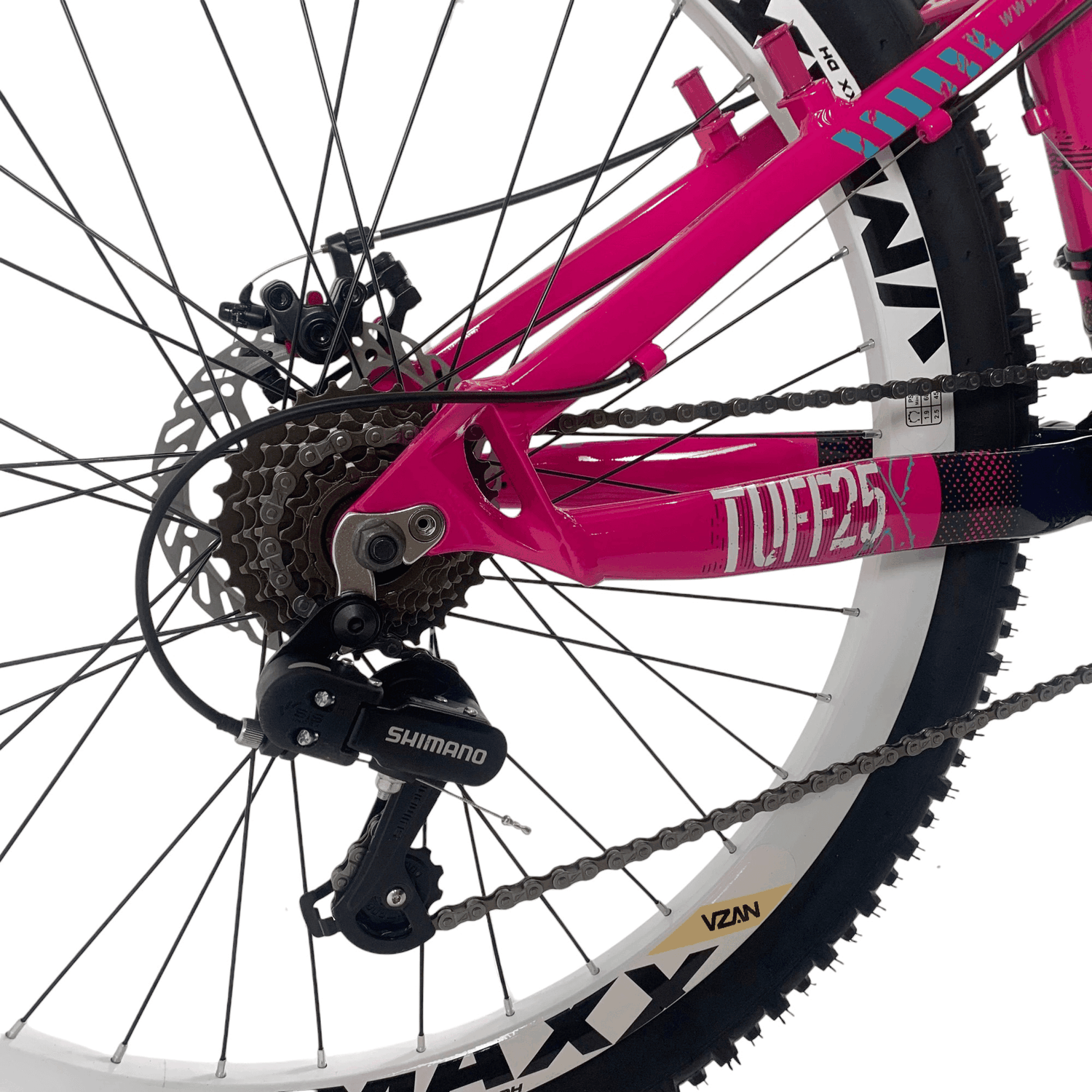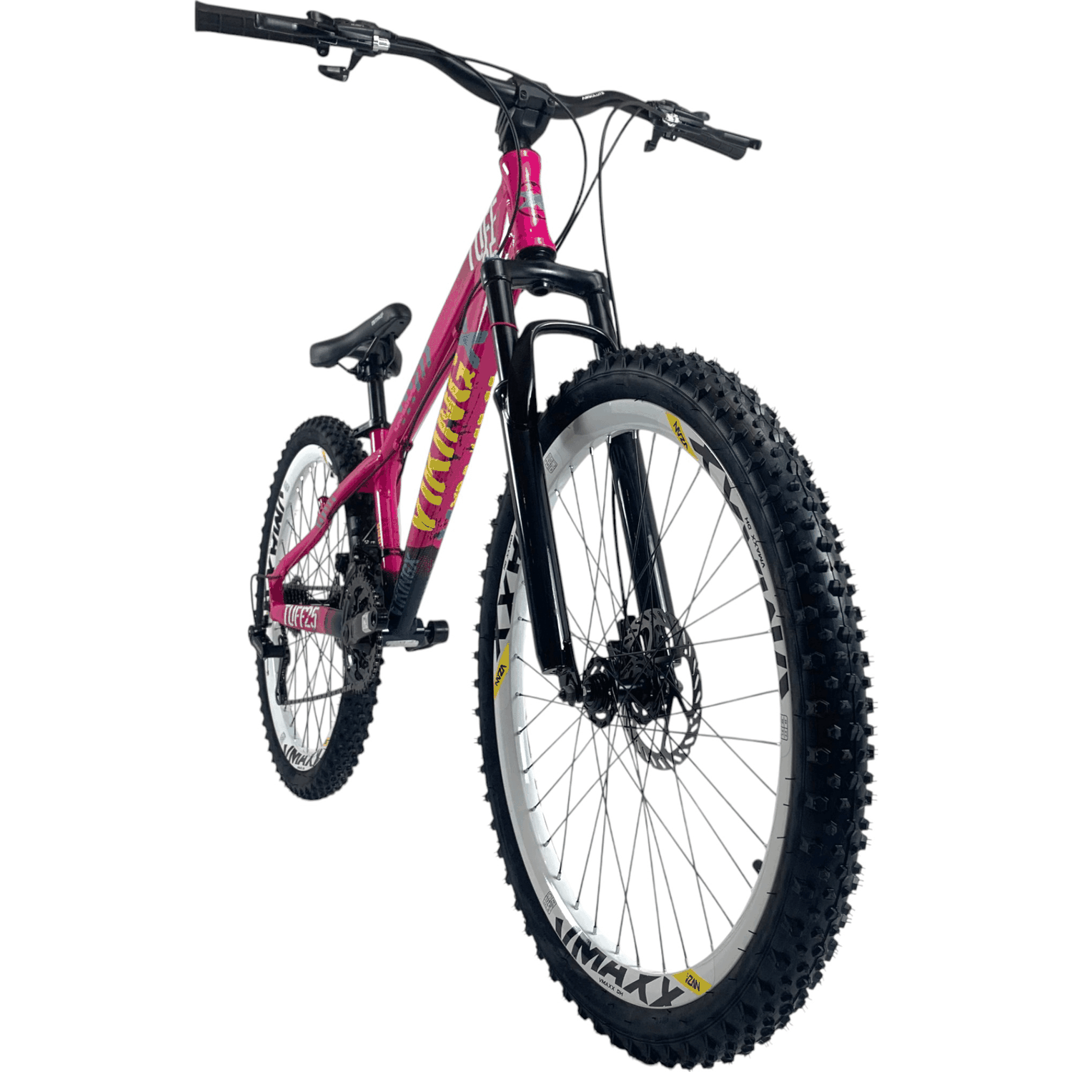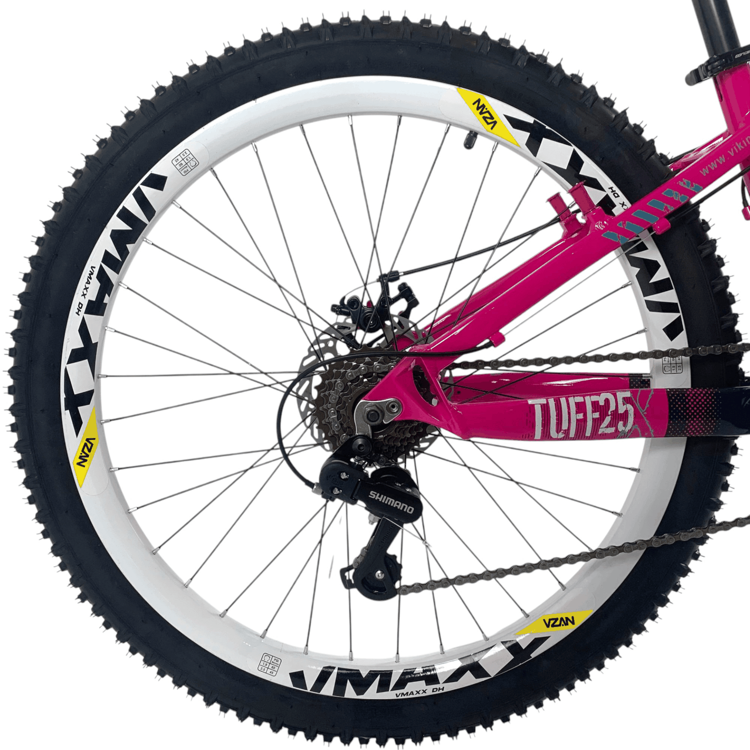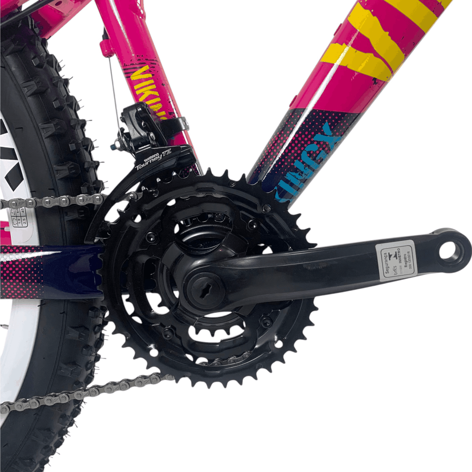 A Bicicleta VikingX Tuff 25 Aro 26 Tourney 21v é perfeita para ciclistas que buscam uma bike resistente, versátil e com um design moderno. Com quadro em alumínio Double Butted e componentes Shimano, essa bicicleta oferece estabilidade e performance em trilhas ou passeios urbanos. Seu visual vibrante nas cores rosa, azul e amarelo garante um estilo único.