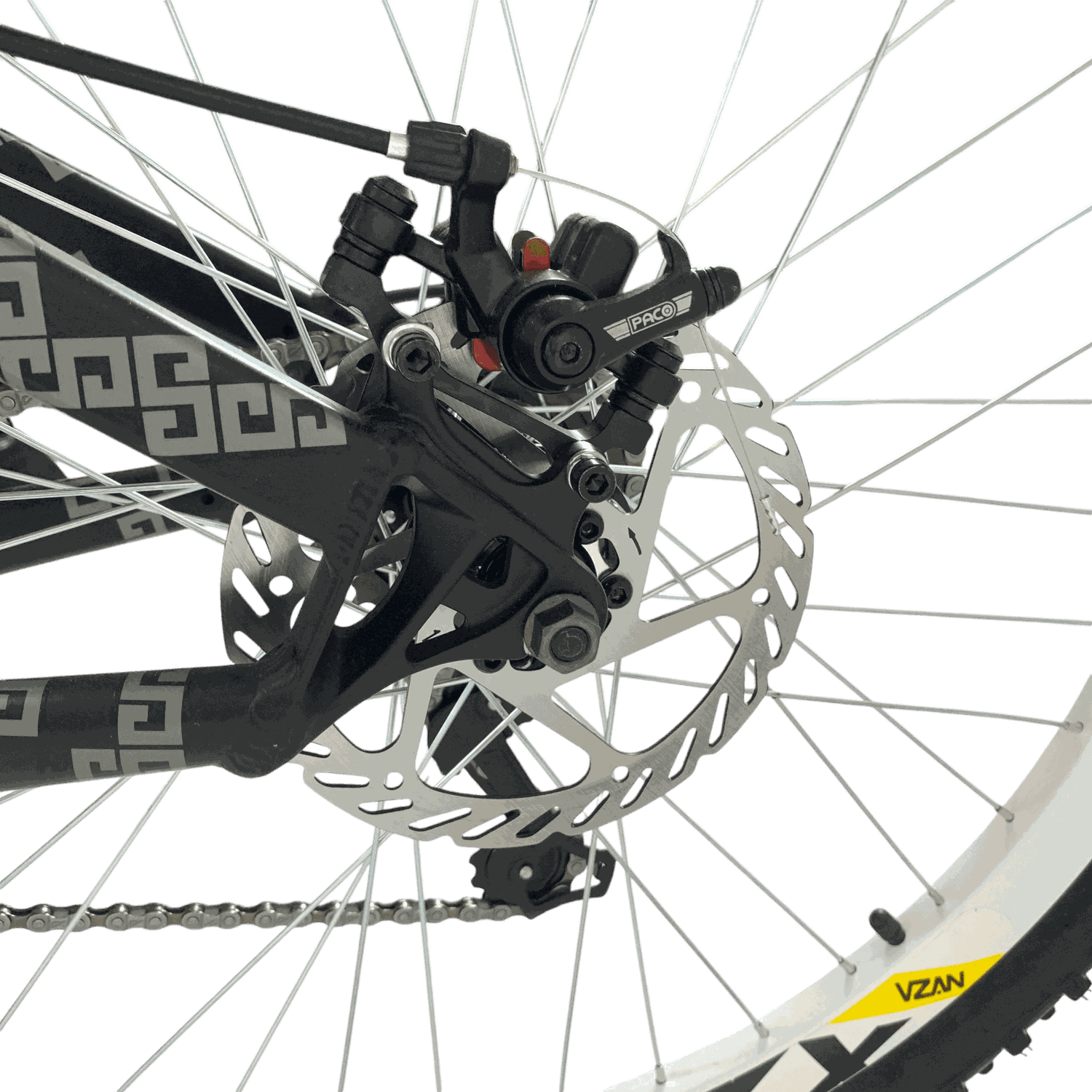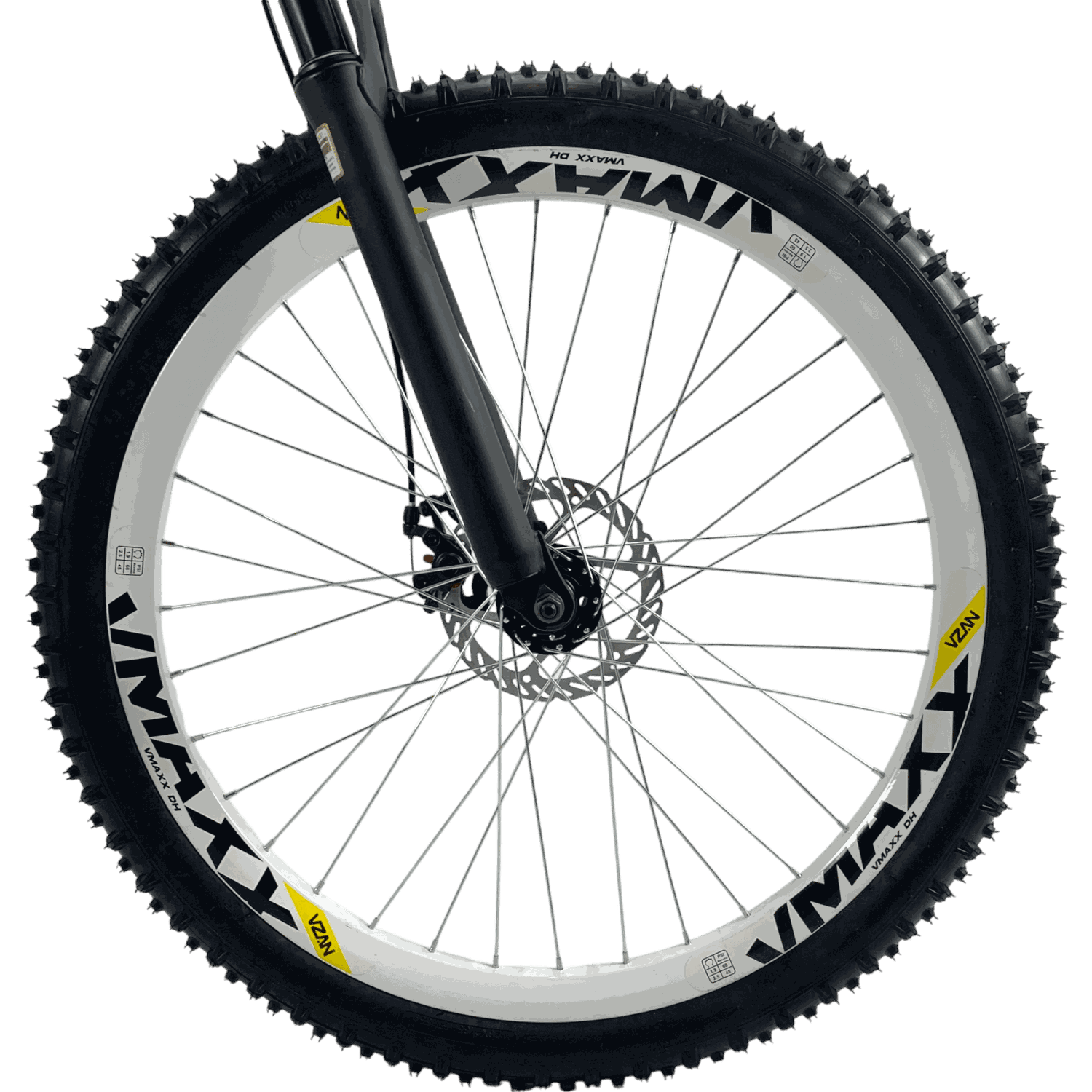Os aros Vzan Vmaxx DH combinados com os pneus DSI 26x2.35 oferecem excelente tração e durabilidade, sendo perfeitos para enfrentar trilhas e terrenos desafiadores. Os cubos de alumínio garantem leveza e resistência, completando o conjunto de rodas robusto e confiável.