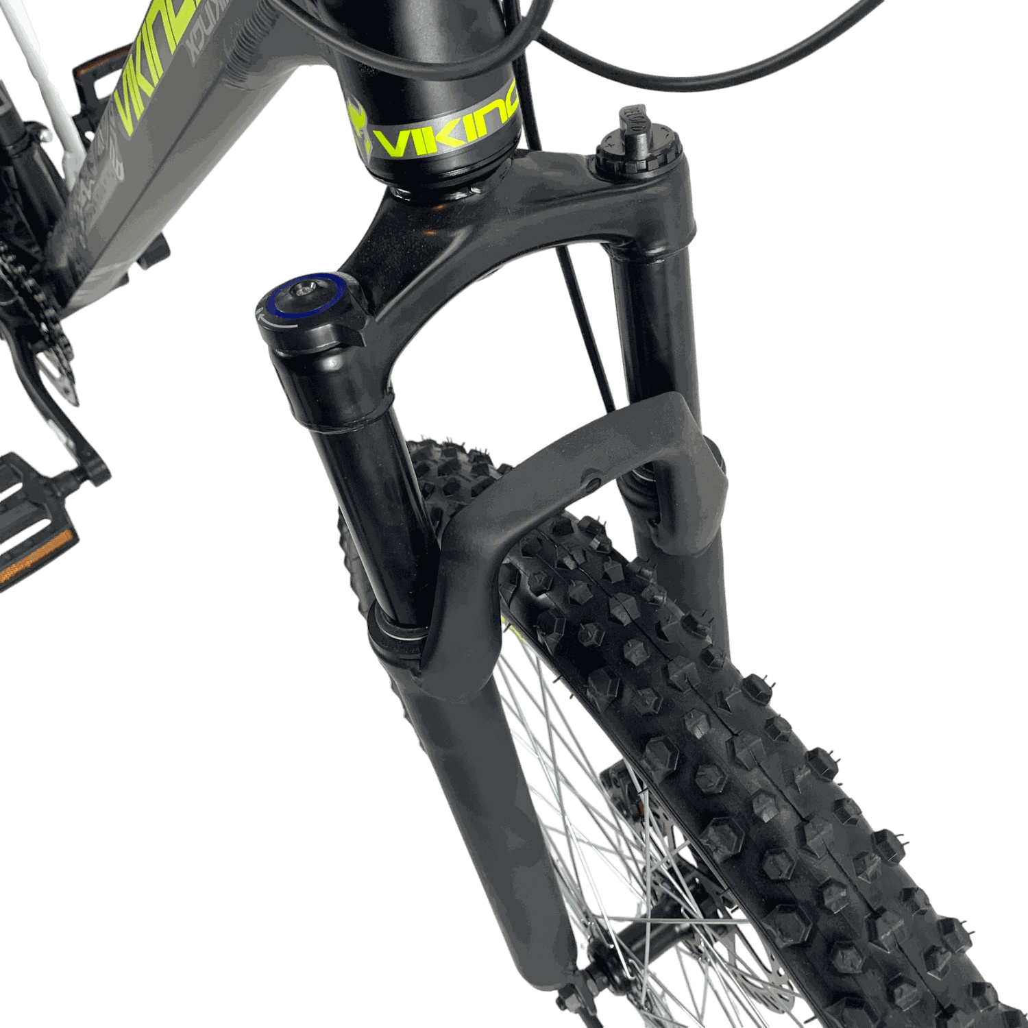 O quadro de alumínio VikingX Tuff 30 oferece leveza e resistência, proporcionando maior durabilidade em terrenos acidentados. A suspensão dianteira Xinmoma 906-28 6-FYF com curso de 120 mm absorve impactos com eficiência, garantindo uma pedalada suave e estável.