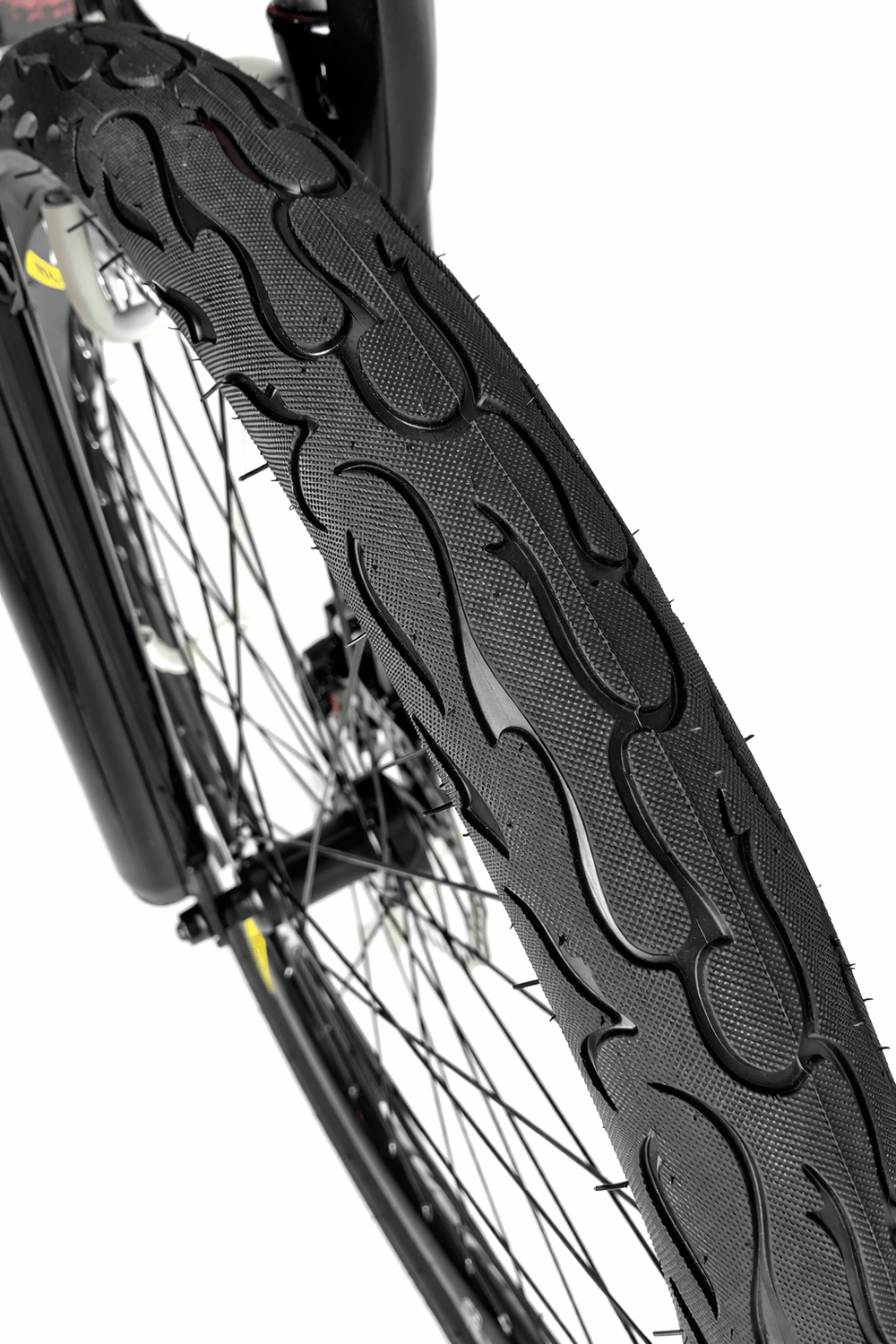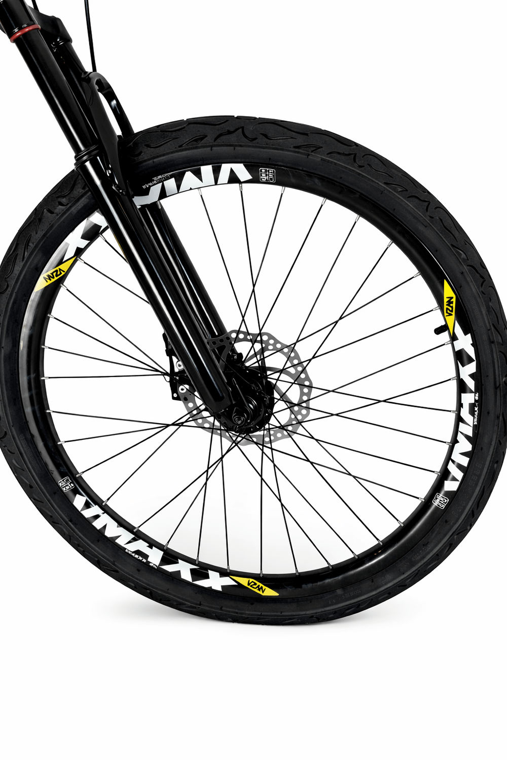 - Cubos: Dianteiro e traseiro em aço, preto, 36 furos, Disc;