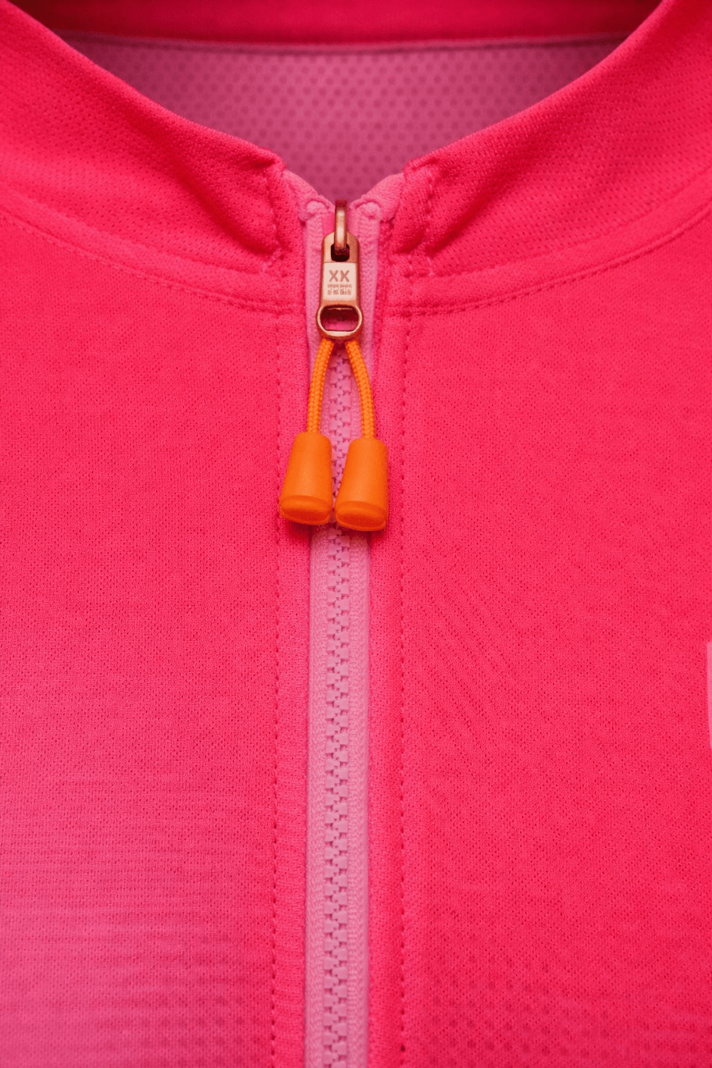 A modelagem unissex com corte anatômico oferece ótimo ajuste ao corpo e liberdade de movimento, garantindo conforto na posição de pedal. O zíper frontal completo permite controlar a ventilação durante o exercício, facilitando o ajuste conforme a intensidade do pedal.