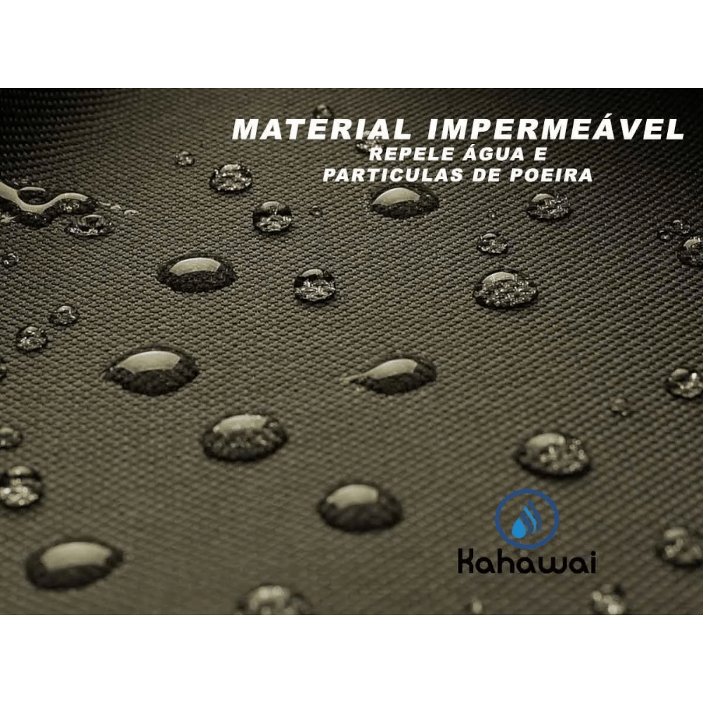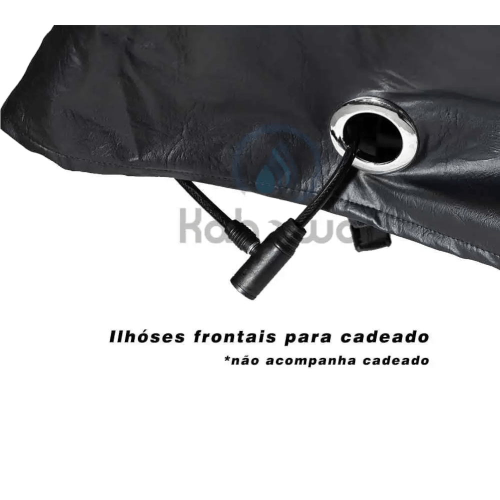 Equipada com ilhós para cadeado e cordão em todo o barrado com botão regulador, a capa proporciona uma fixação segura e ajustável. A praticidade de uso é complementada por uma bolsa exclusiva, tornando a capa leve e fácil de transportar.