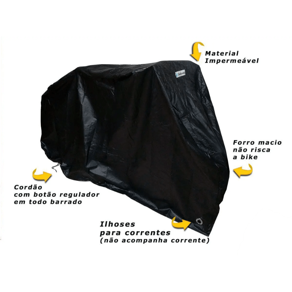 Fabricada com material impermeável super resistente, a capa garante proteção total contra intempéries, como sol, chuva e poeira. Seu design inovador inclui um forro que evita microriscos na pintura da bicicleta, preservando sua estética e valor.