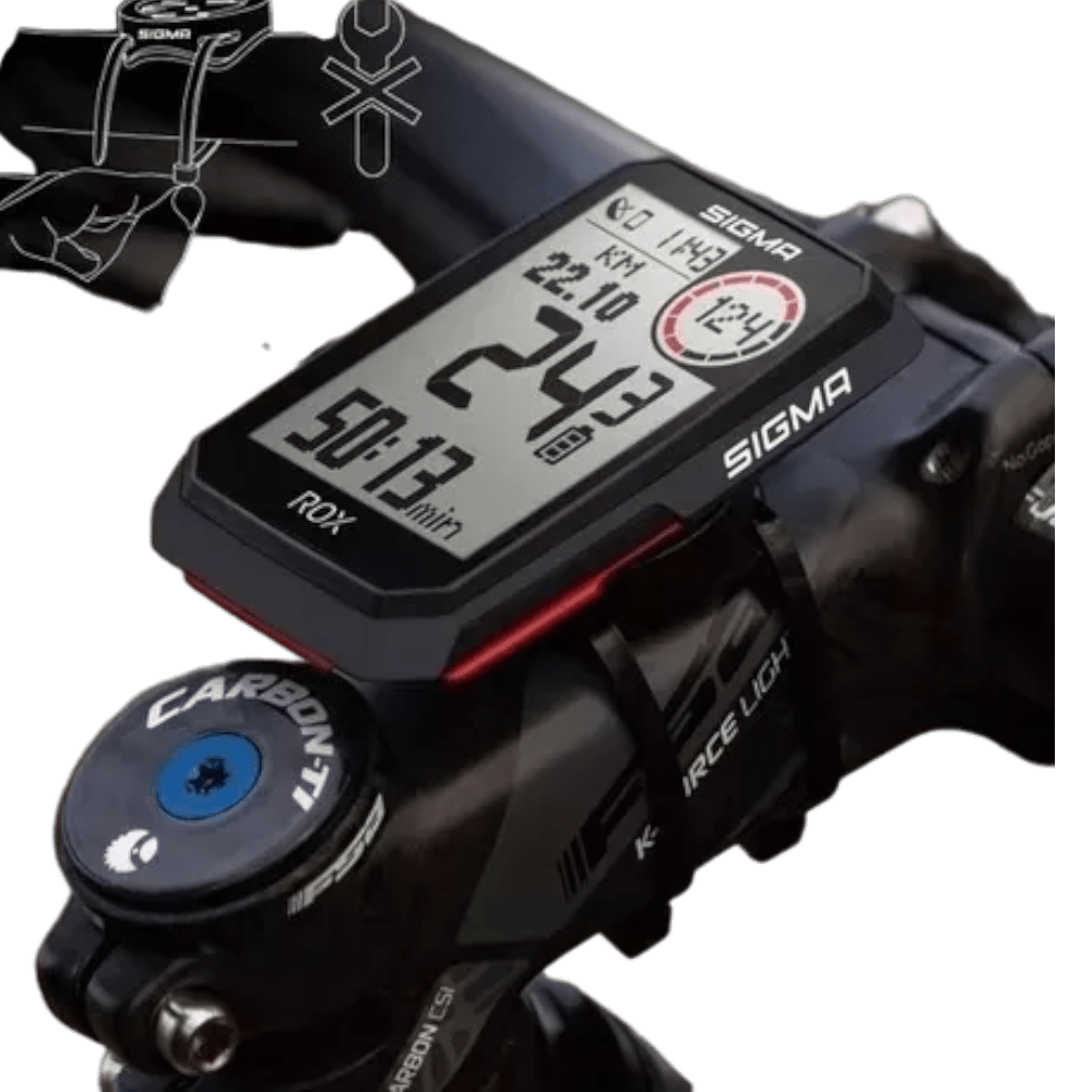 O suporte "Over Clamp Butler" permite posicionar o ROX 4.0 de forma perfeita, mesmo com hastes curtas. Compatível com guidões de 31,8 mm e 35 mm de diâmetro, o suporte clássico SIGMA GPS também pode ser fixado sem ferramentas, garantindo uma instalação rápida e segura.