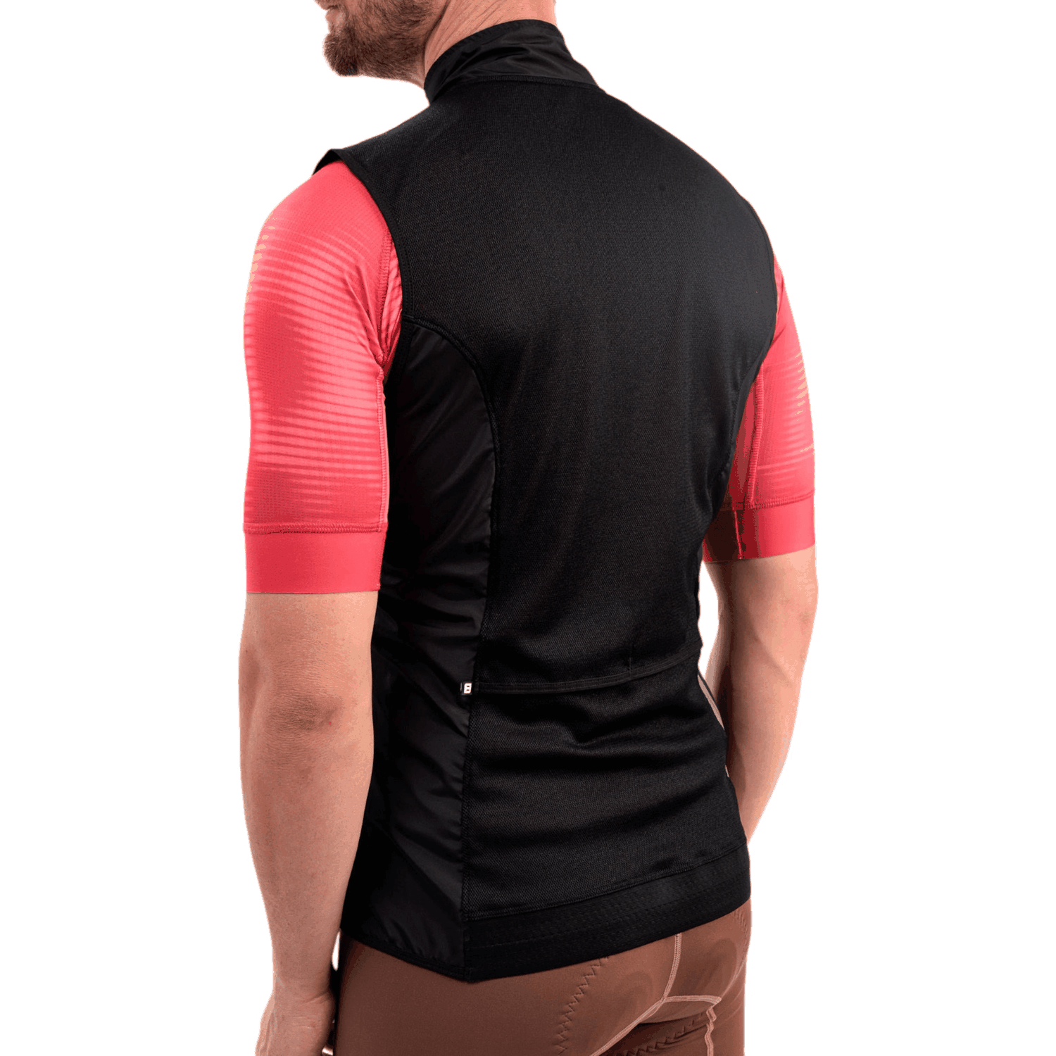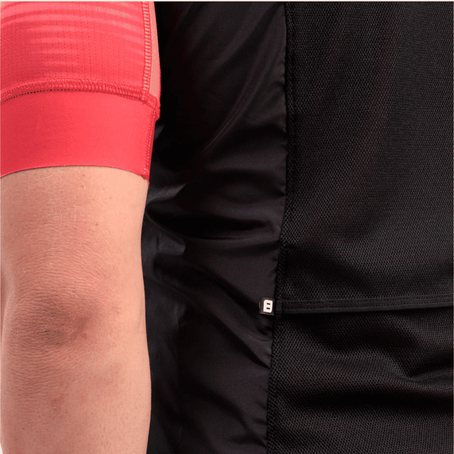 A modelagem slim é otimizada para a posição aerodinâmica de pedalagem, com um caimento justo que elimina sobras de tecido e reduz a resistência ao vento. A base microperfurada nas costas melhora a ventilação, evitando o acúmulo de calor, enquanto o elástico com filamentos de silicone na barra traseira mantém o colete firme, mesmo em contato com superfícies como selins ou mochilas. Dois acessos traseiros estrategicamente posicionados permitem acessar os bolsos da jersey sem levantar a peça, facilitando o armazenamento de géis, barras energéticas ou smartphones durante o pedal.