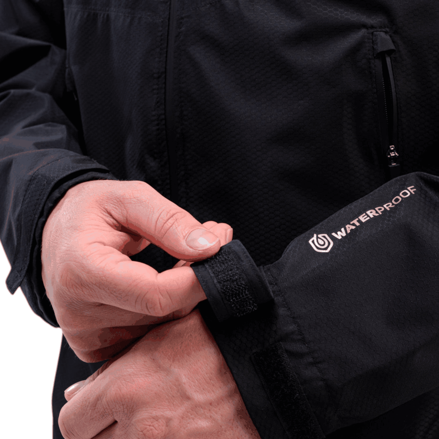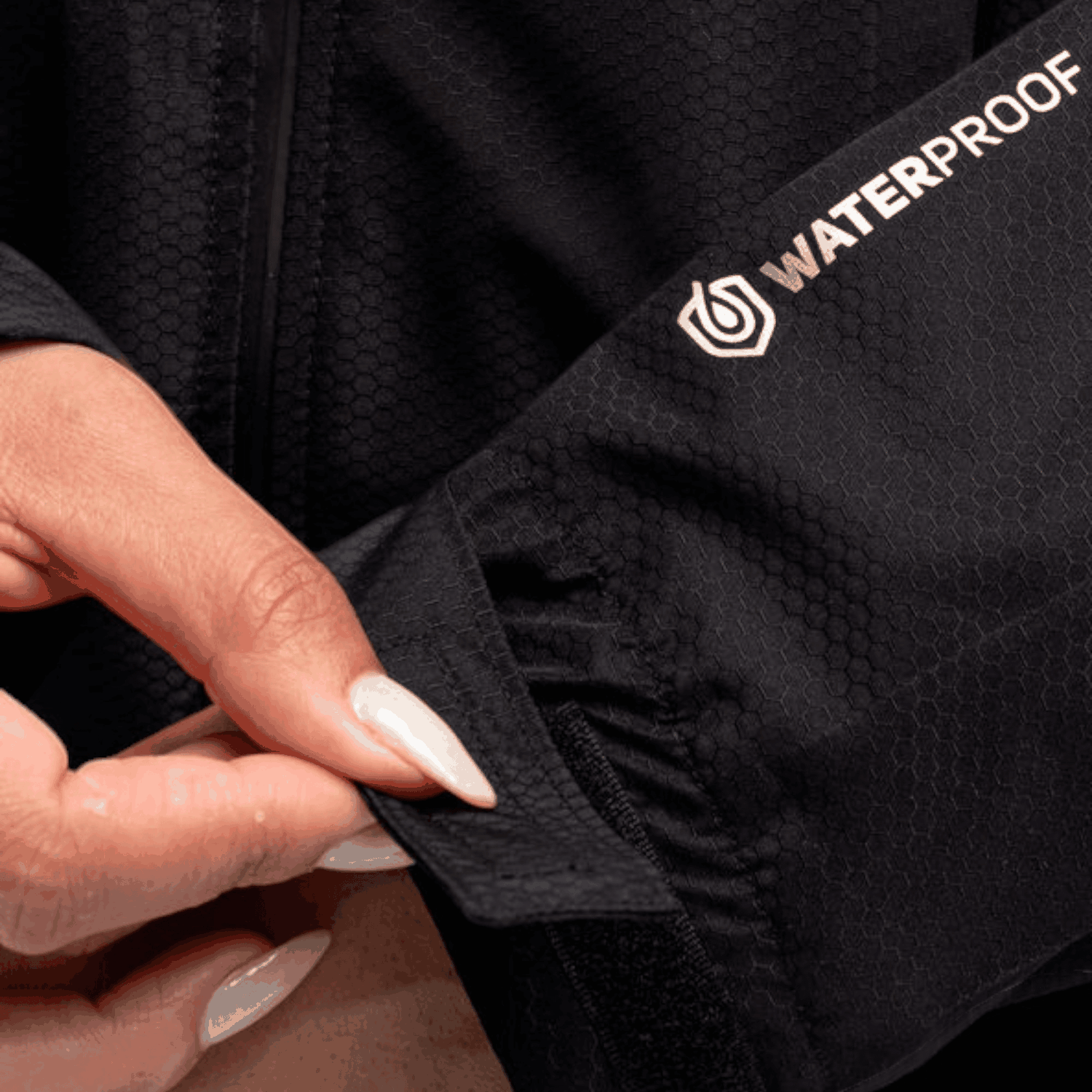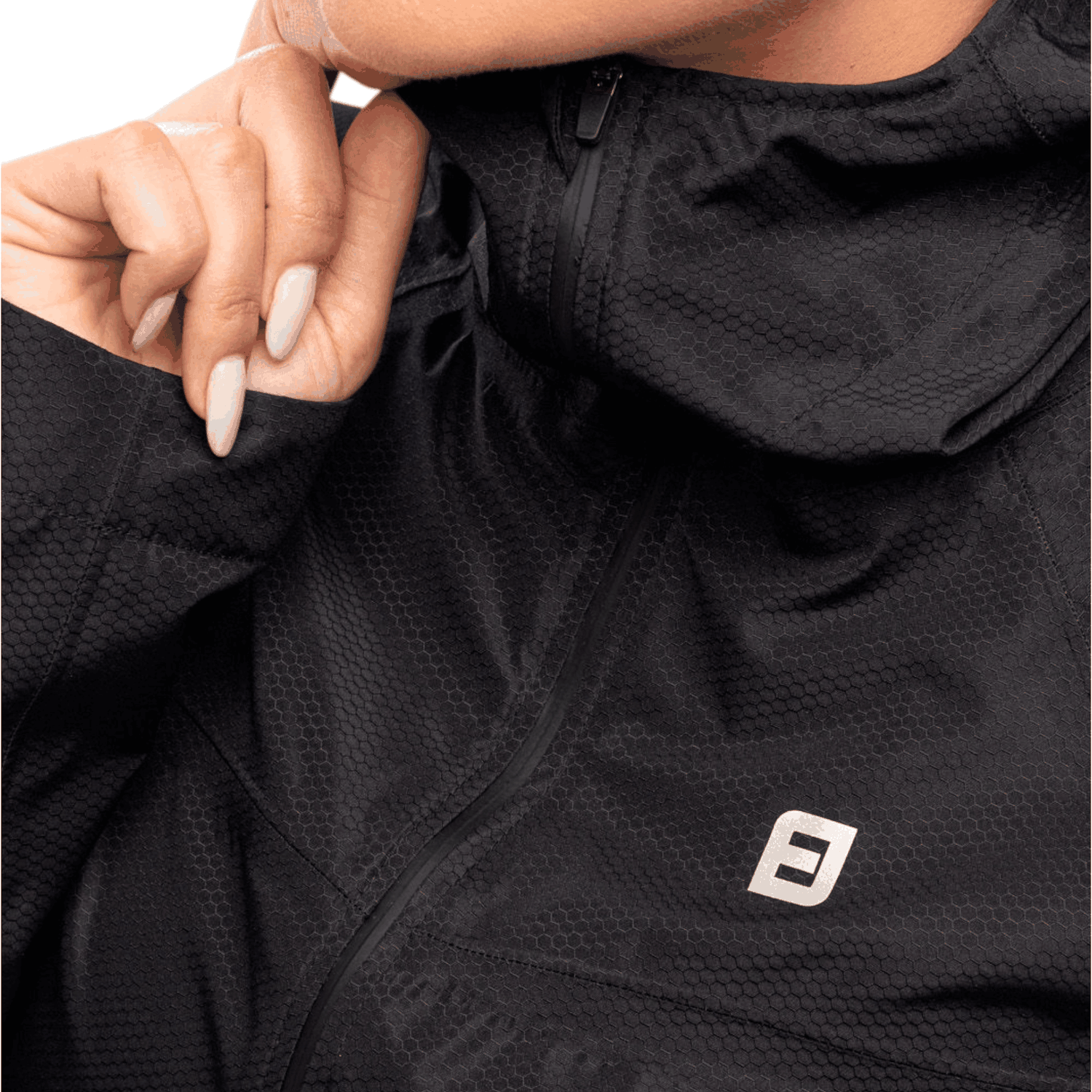 Confeccionada em 100% poliéster com revestimento em TPU respirável e textura de favos de mel, a jaqueta é leve (apenas 233 gramas) e oferece proteção total contra vento e água, desde chuvas leves até as mais intensas. Todas as costuras internas possuem fita selante italiana, garantindo 100% de impermeabilização. O zíper frontal inteligente e impermeável facilita ajustes térmicos e adiciona sofisticação, enquanto os bolsos dianteiros com zíperes impermeáveis asseguram o armazenamento seguro de itens essenciais, como celular, chaves ou barras energéticas. Detalhes refletivos aumentam a visibilidade em condições de baixa luminosidade, garantindo segurança em atividades noturnas. O capuz ajustável e os punhos com velcro oferecem proteção adicional e ajuste personalizado, enquanto uma saída de ar nas costas promove respirabilidade.