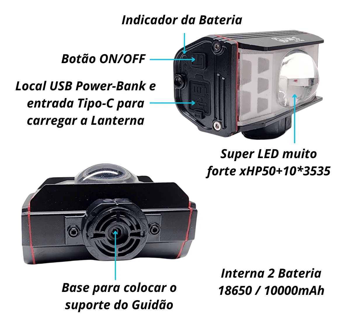 Conta com bateria recarregável de alta capacidade, múltiplos modos de iluminação e fixação prática no guidão, sendo perfeito para MTB, ciclismo urbano e estrada. É um kit completo para quem leva a segurança a sério no pedal.