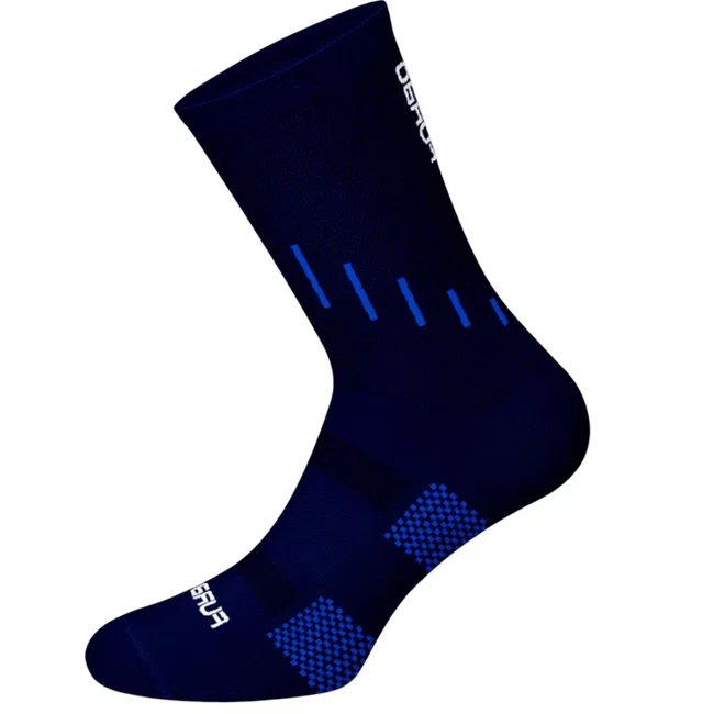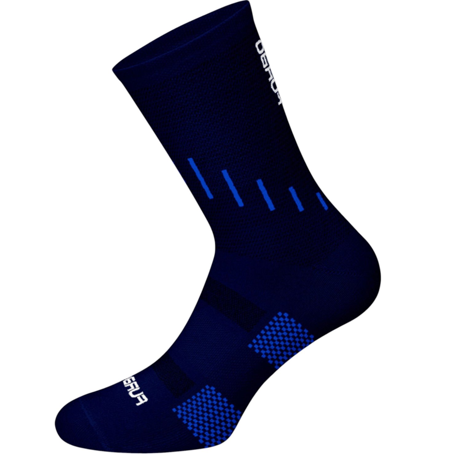 Com foco em conforto, a meia possui acabamento acolchoado na sola para reduzir impactos e fios Lycra® que promovem circulação sanguínea. A combinação de cores azul marinho/azul claro adiciona um toque estilizado, tornando-a versátil para ciclistas de todos os níveis.