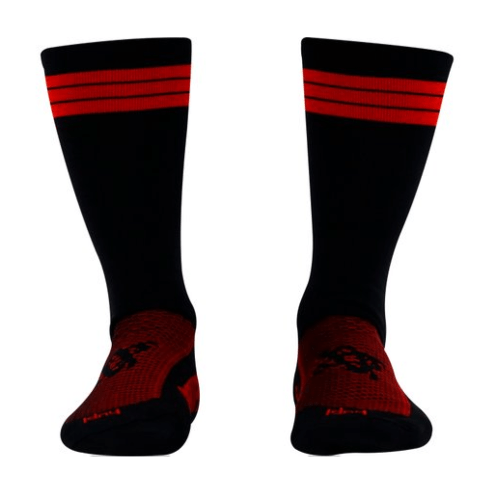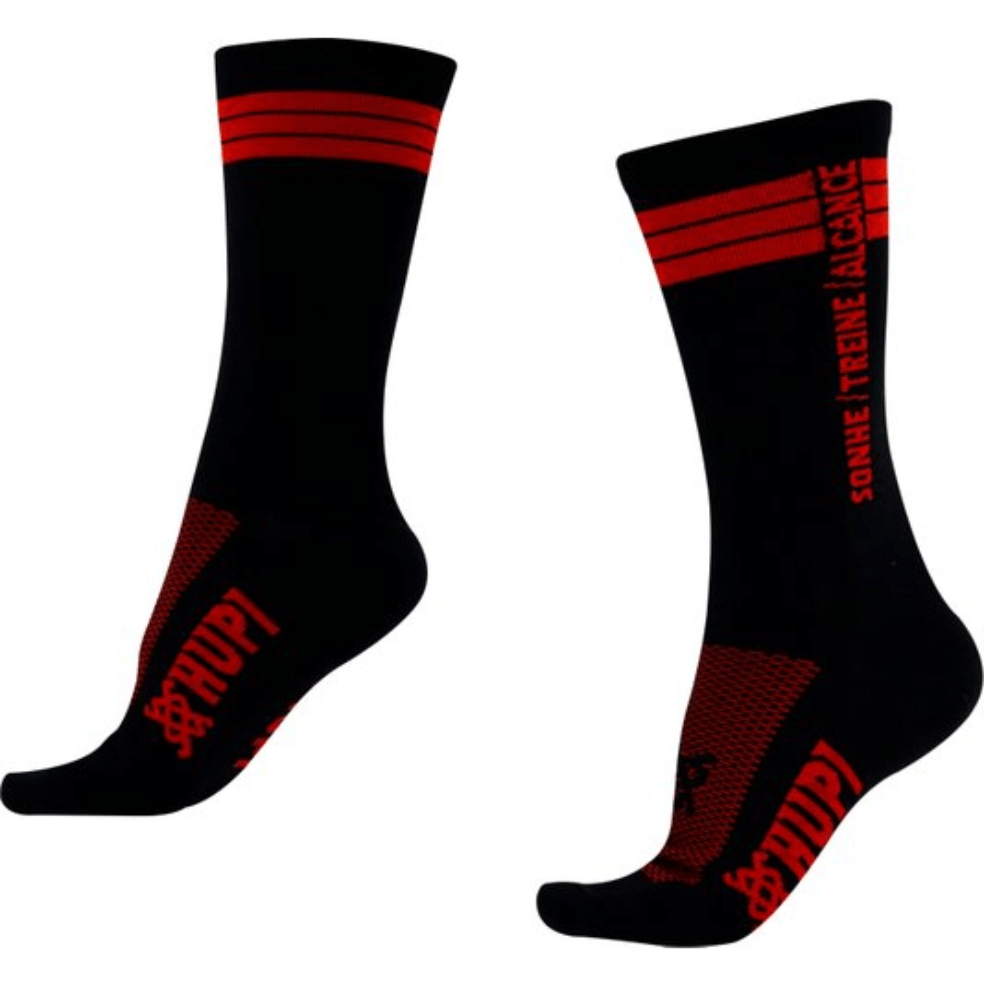 Conforto, design, tecnologia e qualidade são adjetivos que descrevem perfeitamente as meias HUPI. Testado e aprovado por atletas de diversas modalidades, a meia HUPI é um item indispensável para você. Praticar esportes com conforto e máximo desempenho é o seu objetivo, e também o nosso. Por isso a meia HUPI apresenta diversos destaques que fazem dela um item fundamental. O material utilizado na fabricação da meia é importado da Alemanha. Os fios de elastano e poliamida formam um conjunto cheio de vantagens. O principal destaque é o conforto, proporcionado pela transpiração que a meia oferece, deixando os pés secos e bem protegidos. A combinação da matéria prima assegura a flexibilidade oferecendo maior liberdade de movimento, sem que a peça laceie, perdendo sustentação. Na região dos dedos e calcanhar, os fios são dispostos em direções diferentes do restante da meia, fazendo com que a modelagem se torne muito mais anatômica, acompanhando o desenho dos pés. Esta característica também prolonga a durabilidade, impedindo o desgaste.