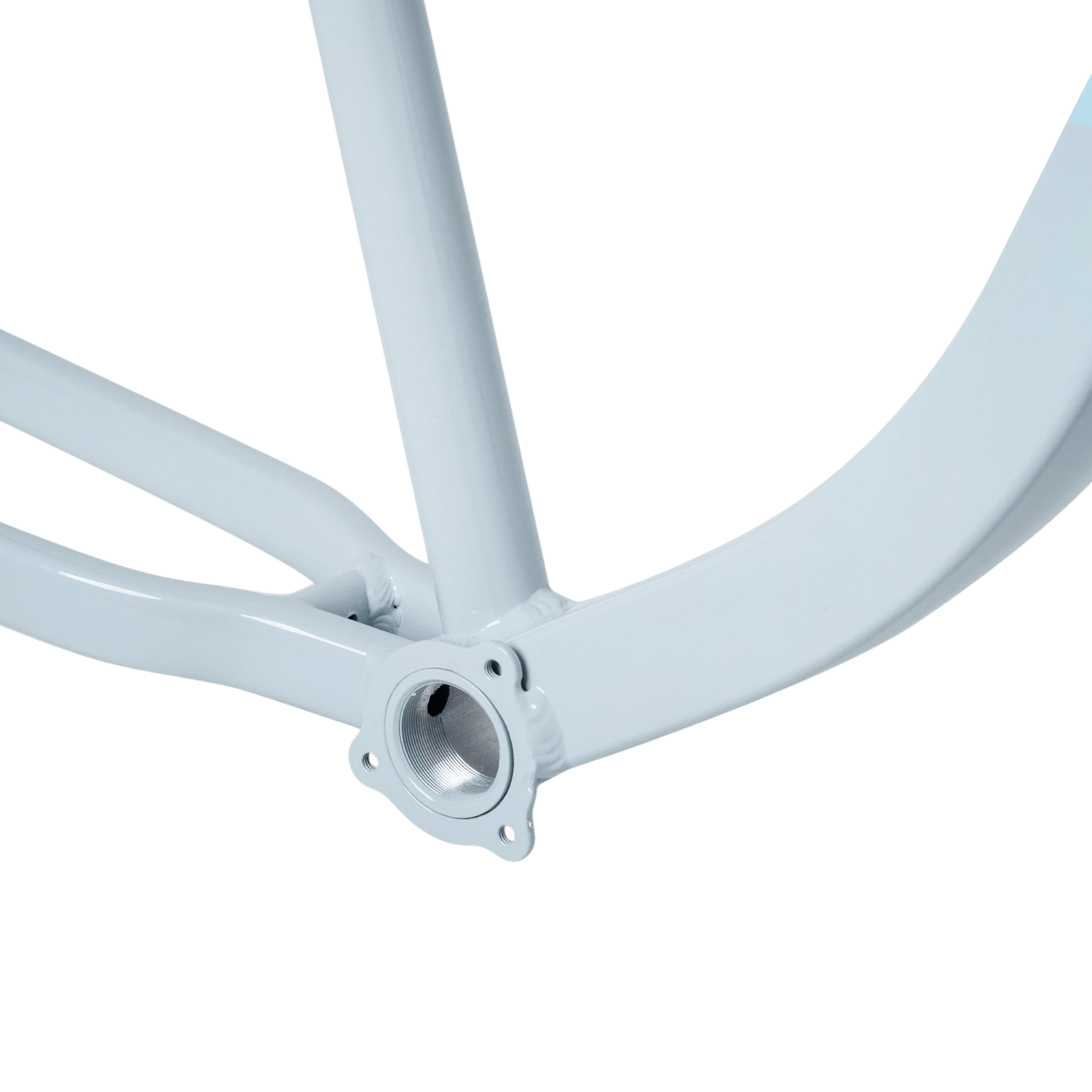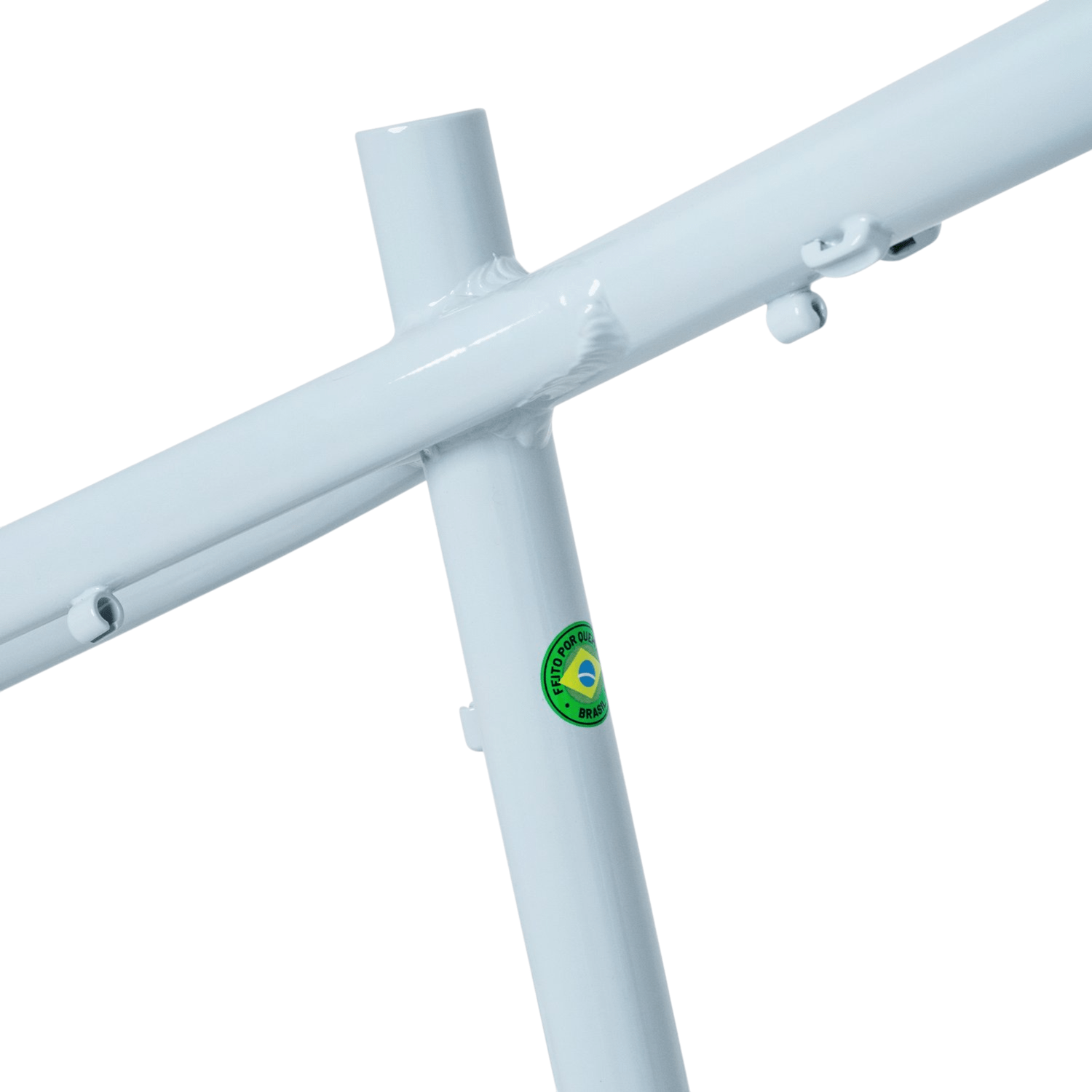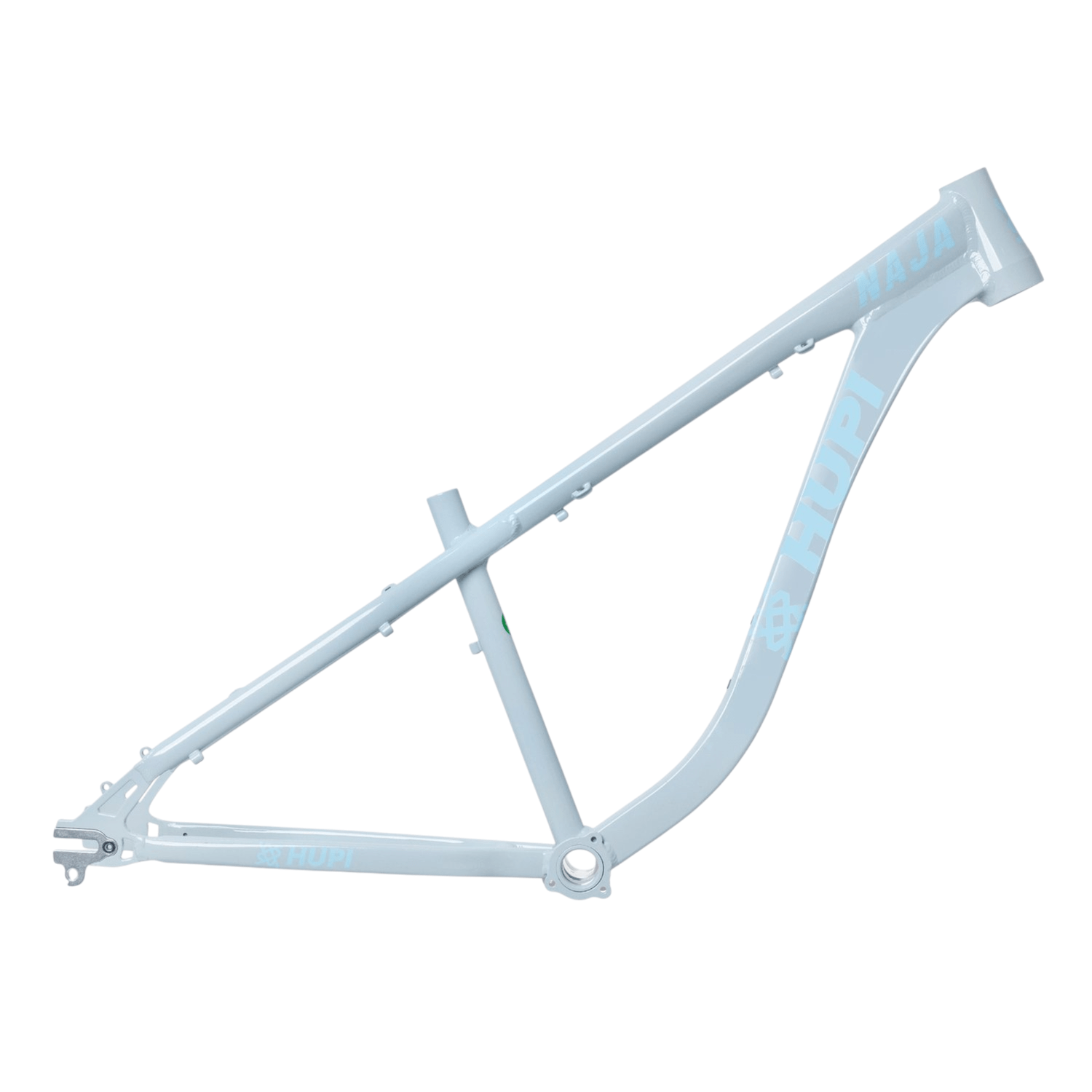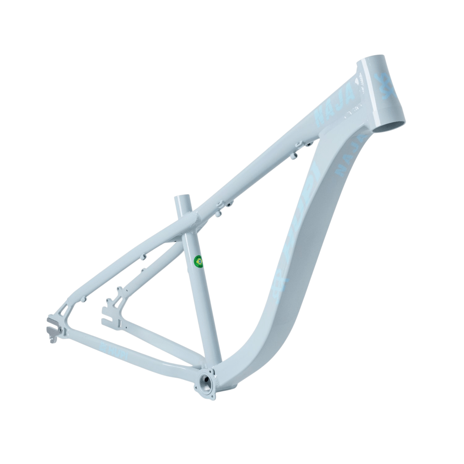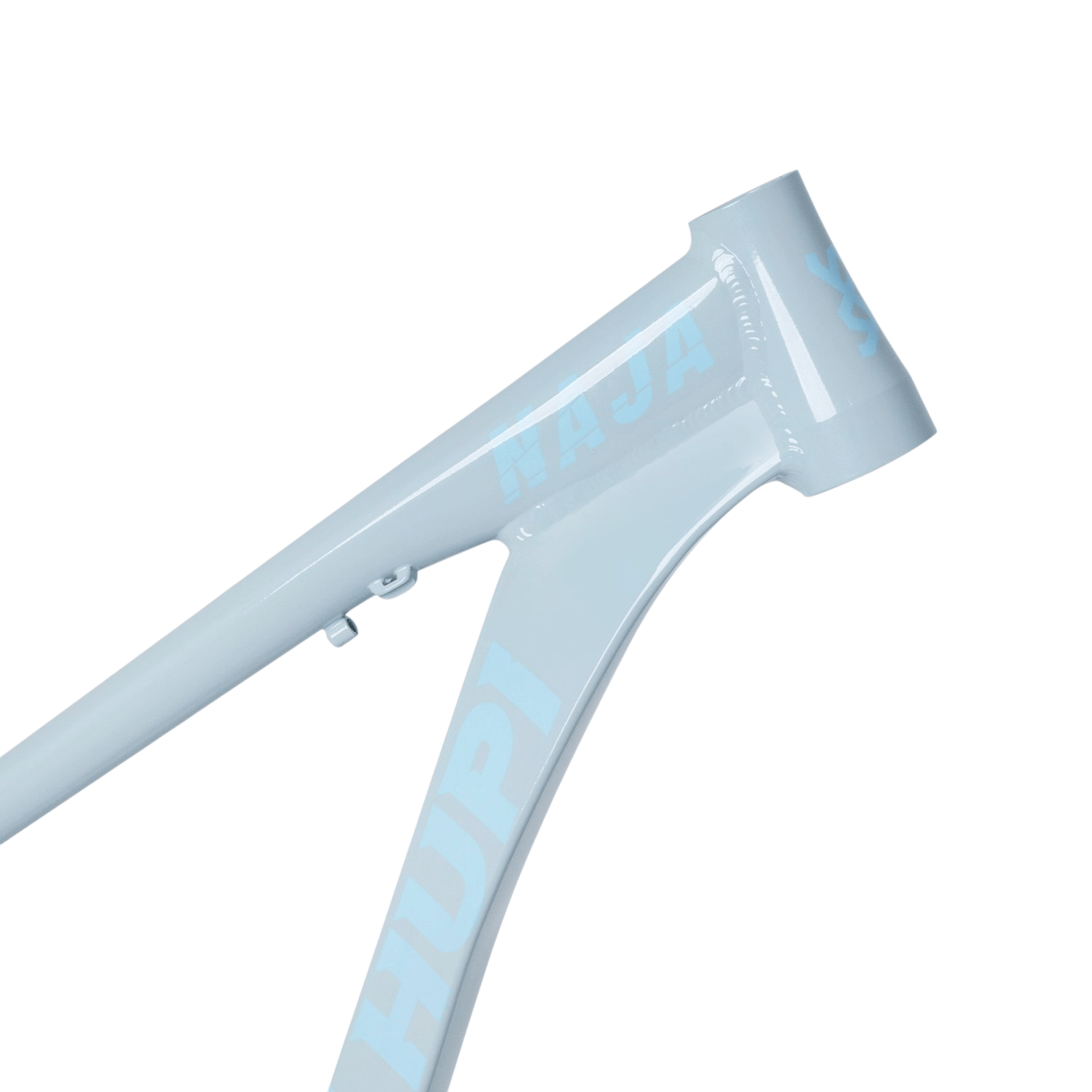 A gancheira horizontal permite ajuste preciso da corrente, facilitando montagens single speed e garantindo maior controle e segurança. Já a caixa de direção tapered proporciona mais rigidez frontal e estabilidade, melhorando a pilotagem e a resposta da bike. O acabamento em cinza com detalhes em azul reforça o estilo moderno e agressivo característico da linha NAJA, um dos quadros mais desejados da HUPI.